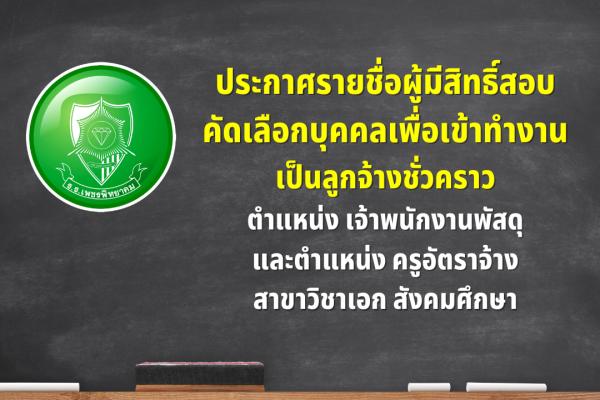 ประกาศรายชื่อผู้มีสิทธิ์เข้ารับการสอบคัดเลือกบุคคลเพื่อเข้าทำงานเป็นลูกจ้างชั่วคราว ตำแหน่ง เจ้าพนักงานพัสดุ และตำแหน่ง ครูอัตราจ้าง สาขาวิชาเอก สังคมศึกษา