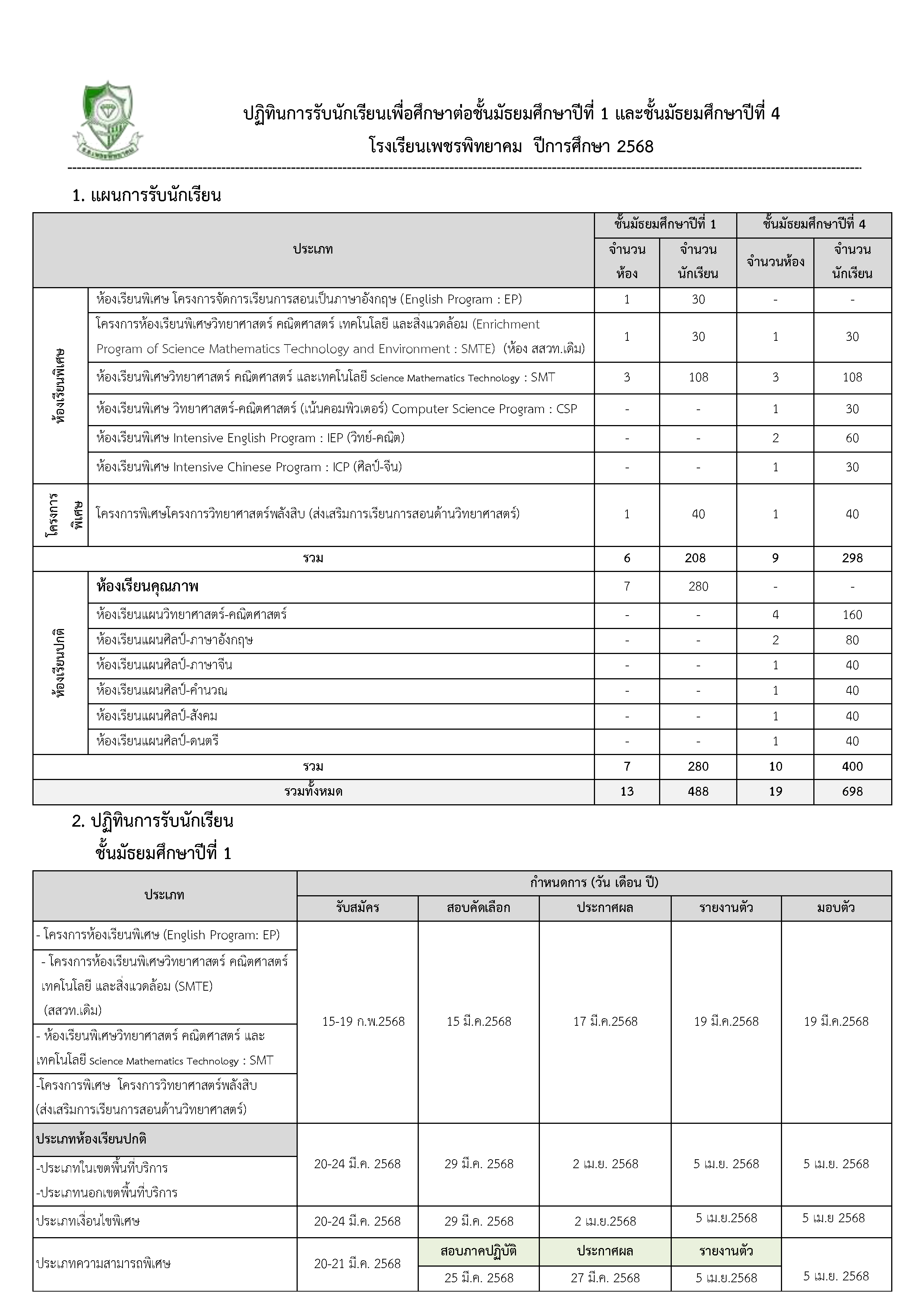 ปฏิทินการรับนักเรียนเพื่อศึกษาต่อชั้นมัธยมศึกษาปีที่ 1 และชั้นมัธยมศึกษาปีที่ 4 โรงเรียนเพชรพิทยาคม ปีการศึกษา 2568