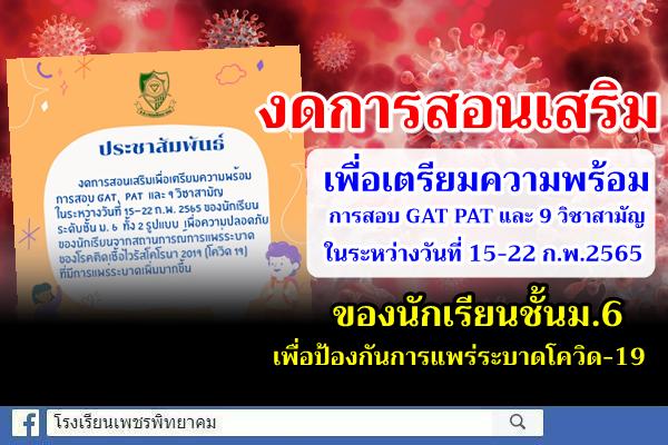 งดการสอนเสริมเพื่อเตรียมความพร้อมการสอบ GAT PAT และ 9 วิชาสามัญ ของนักเรียนชั้นม.6 ในระหว่างวันที่ 15-22 ก.พ.2565