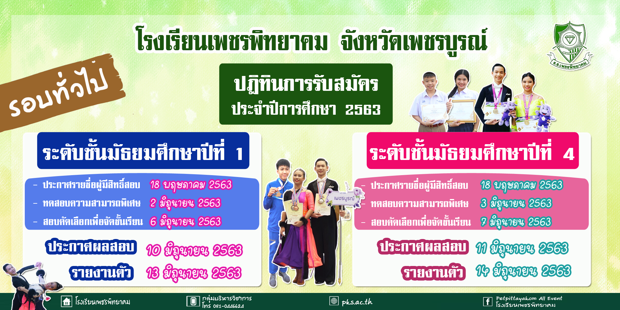 โรงเรียนเพชรพิทยาคม จึงประกาศเปลี่ยนแปลงปฏิทินการสอบคัดเลือกและการมอบตัวนักเรียนชั้นมัธยมศึกษาปีที่ 1 และชั้นมัธยมศึกษาปีที่ 4 ปีการศึกษา 2563 (รอบทั่วไป) ในสถานการณ์แพร่ระบาดของโรคติดเชื้อไวรัสโคโรน่า 2019 (COVID 19) โดยมีรายละเอียด ดังนี้