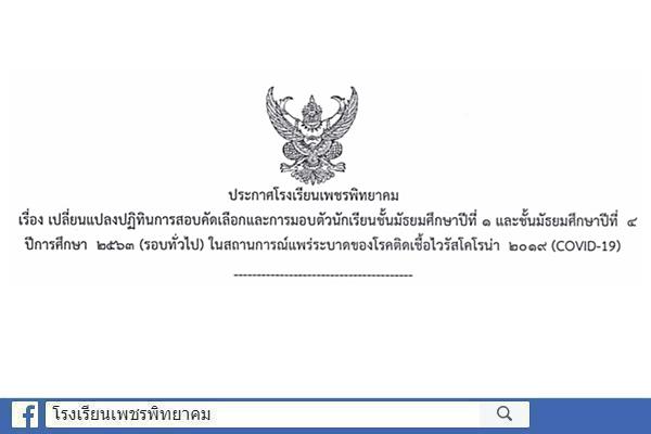 ประกาศโรงเรียนเพชรพิทยาคม เรื่อง เปลี่ยนแปลงปฏิทินการสอบคัดเลือกและการมอบตัวนักเรียนชั้นมัธยมศึกษาปีที่ 1 และชั้นมัธยมศึกษาปีที่ 4 ปีการศึกษา 2563 (รอบทั่วไป) ในสถานการณ์แพร่ระบาดของโรคติดเชื้อไวรัสโคโรน่า 2019(COVID 19)