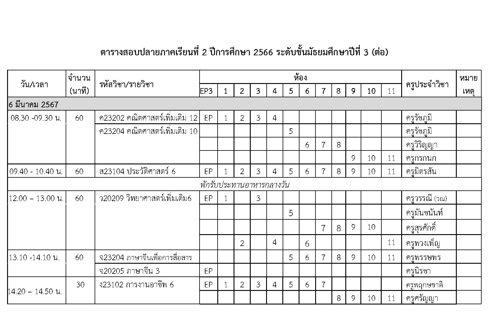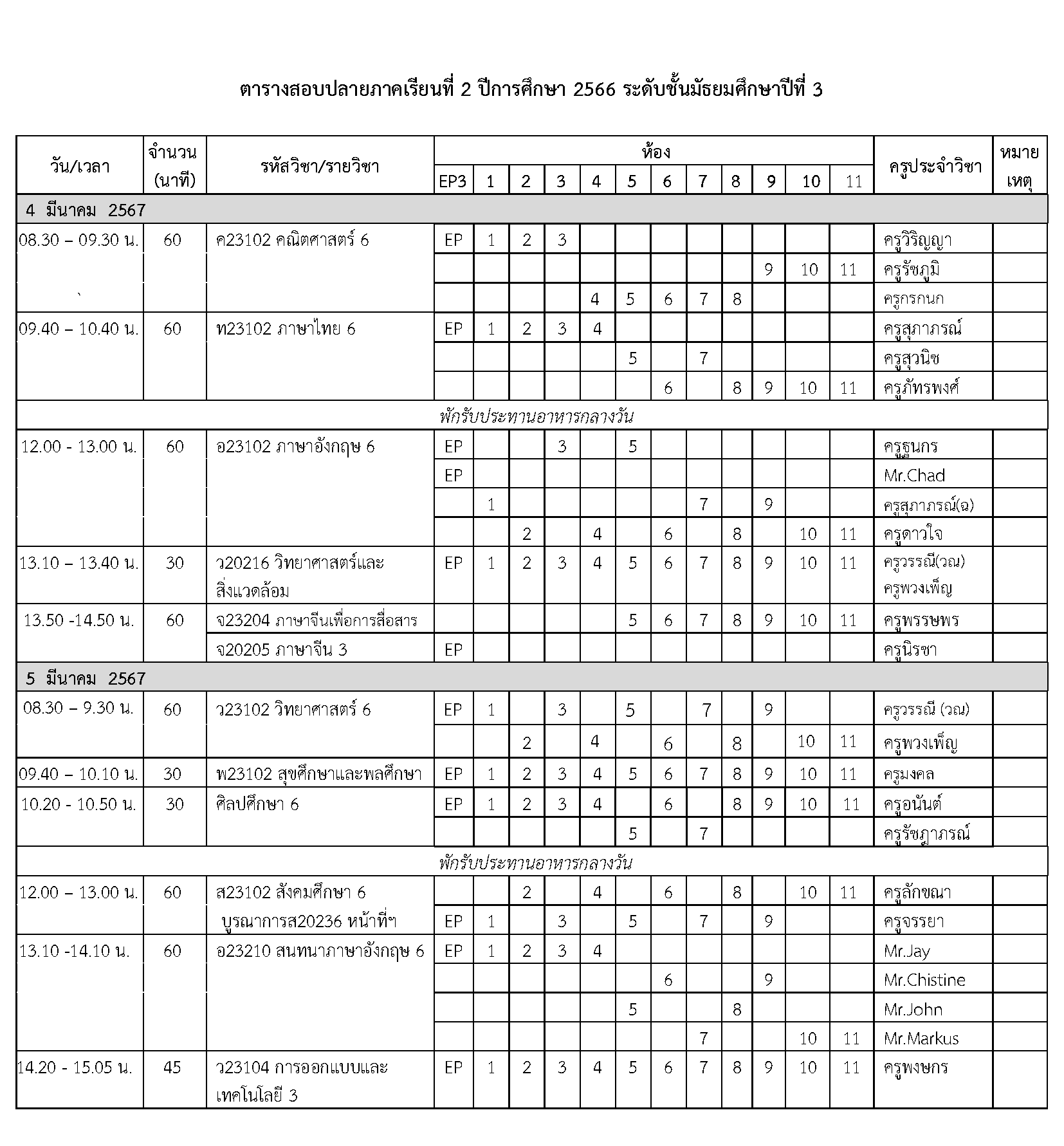 ตารางสอบปลายภาคเรียนที่ 2 ปีการศึกษา 2566 ระดับชั้นมัธยมศึกษาปีที่ 3