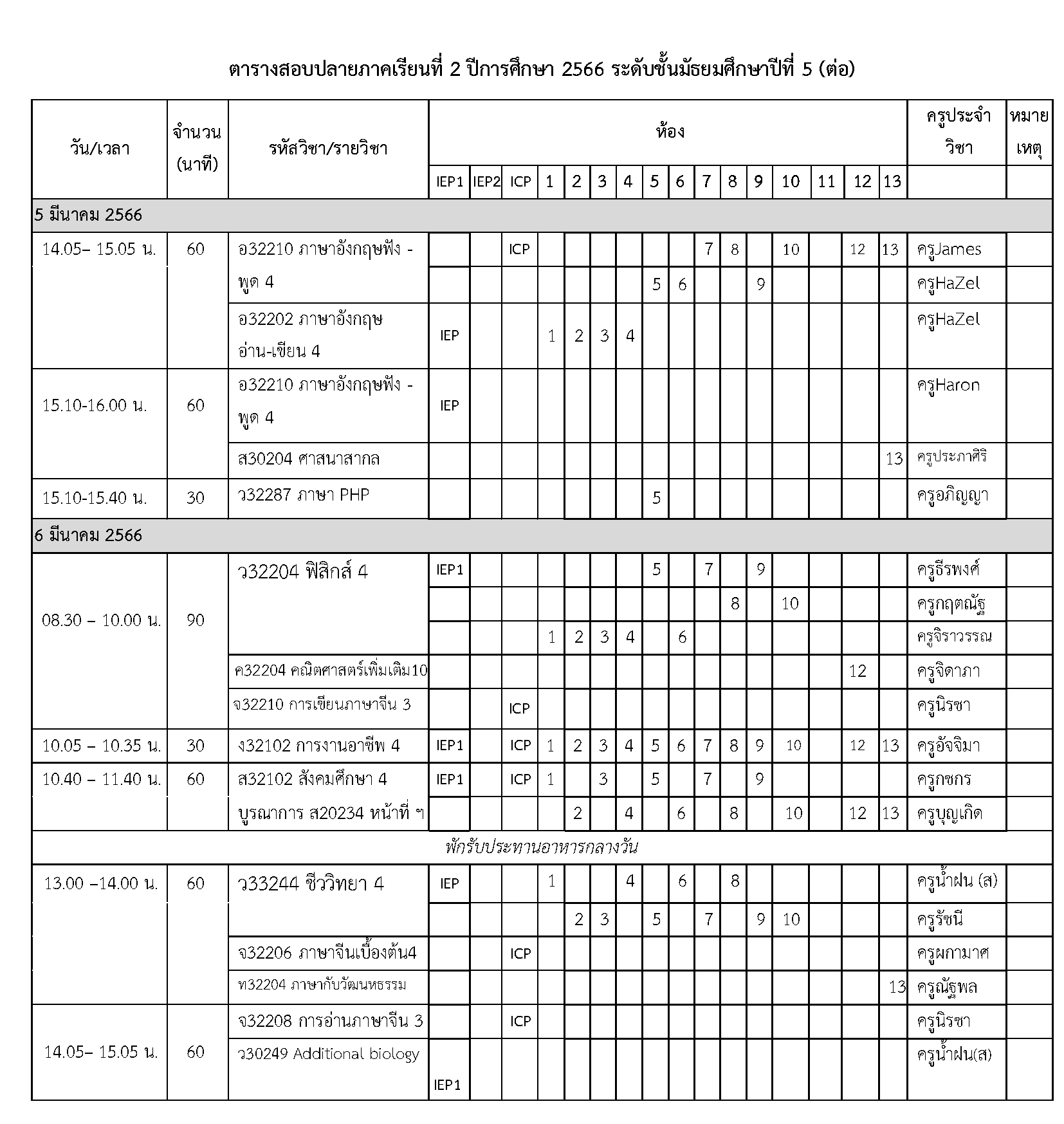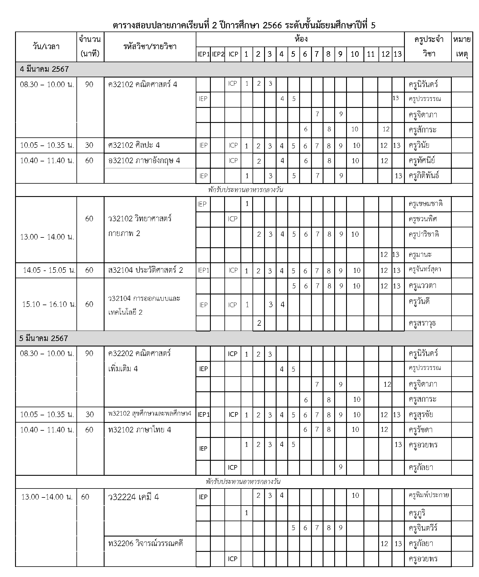 ตารางสอบปลายภาคเรียนที่ 2 ปีการศึกษา 2566 ระดับชั้นมัธยมศึกษาปีที่ 5