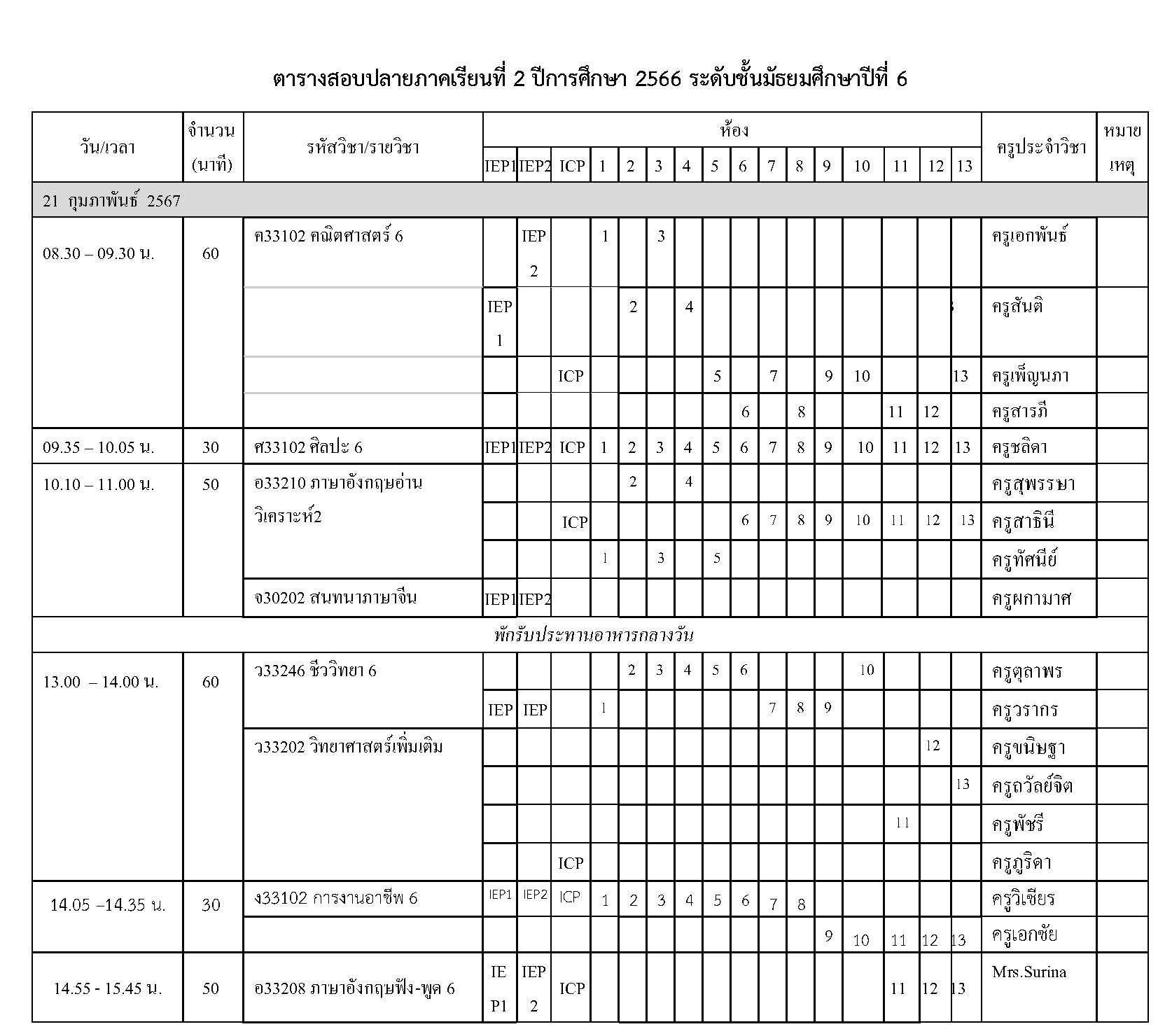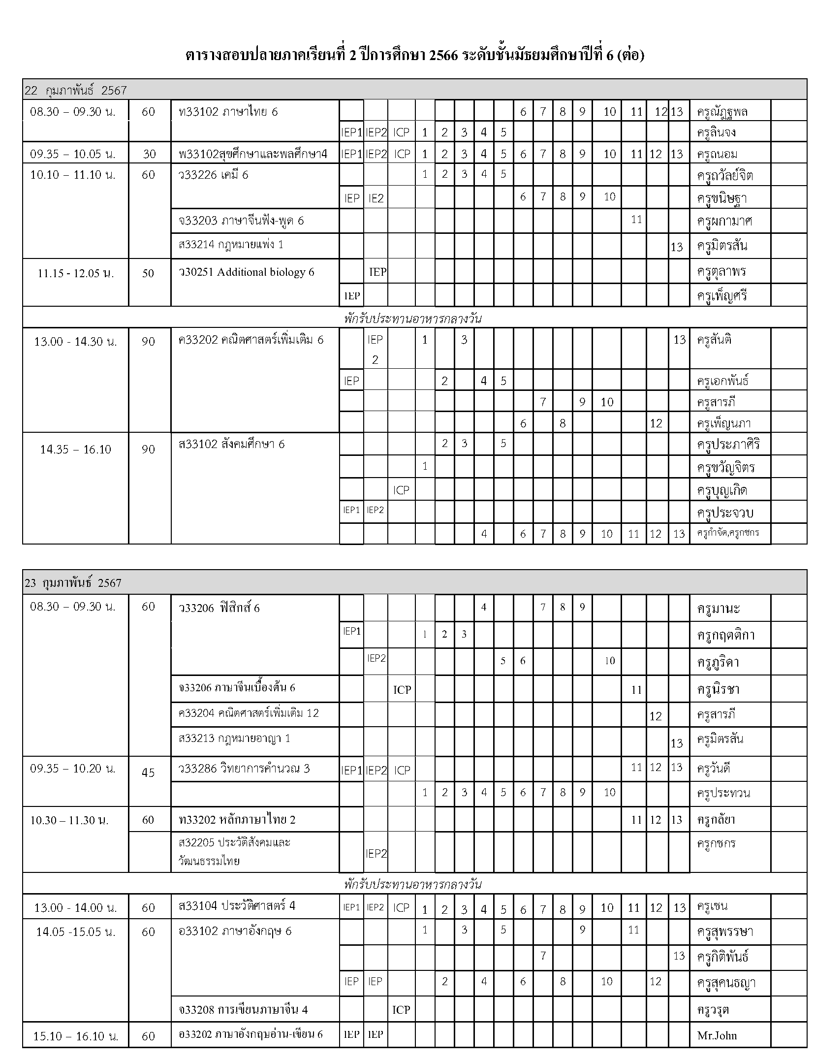 ตารางสอบปลายภาคเรียนที่ 2 ปีการศึกษา 2566 ระดับชั้นมัธยมศึกษาปีที่ 6