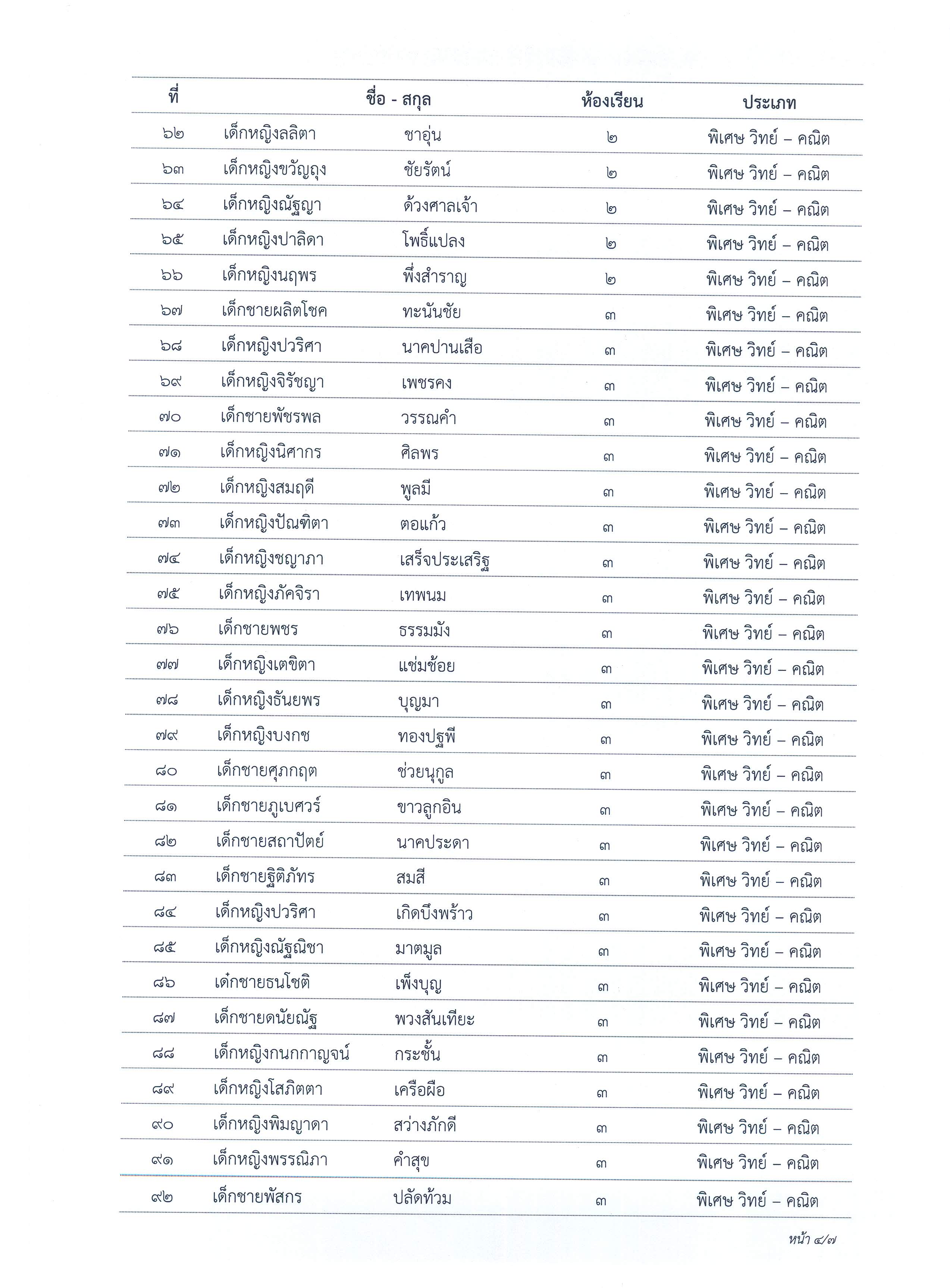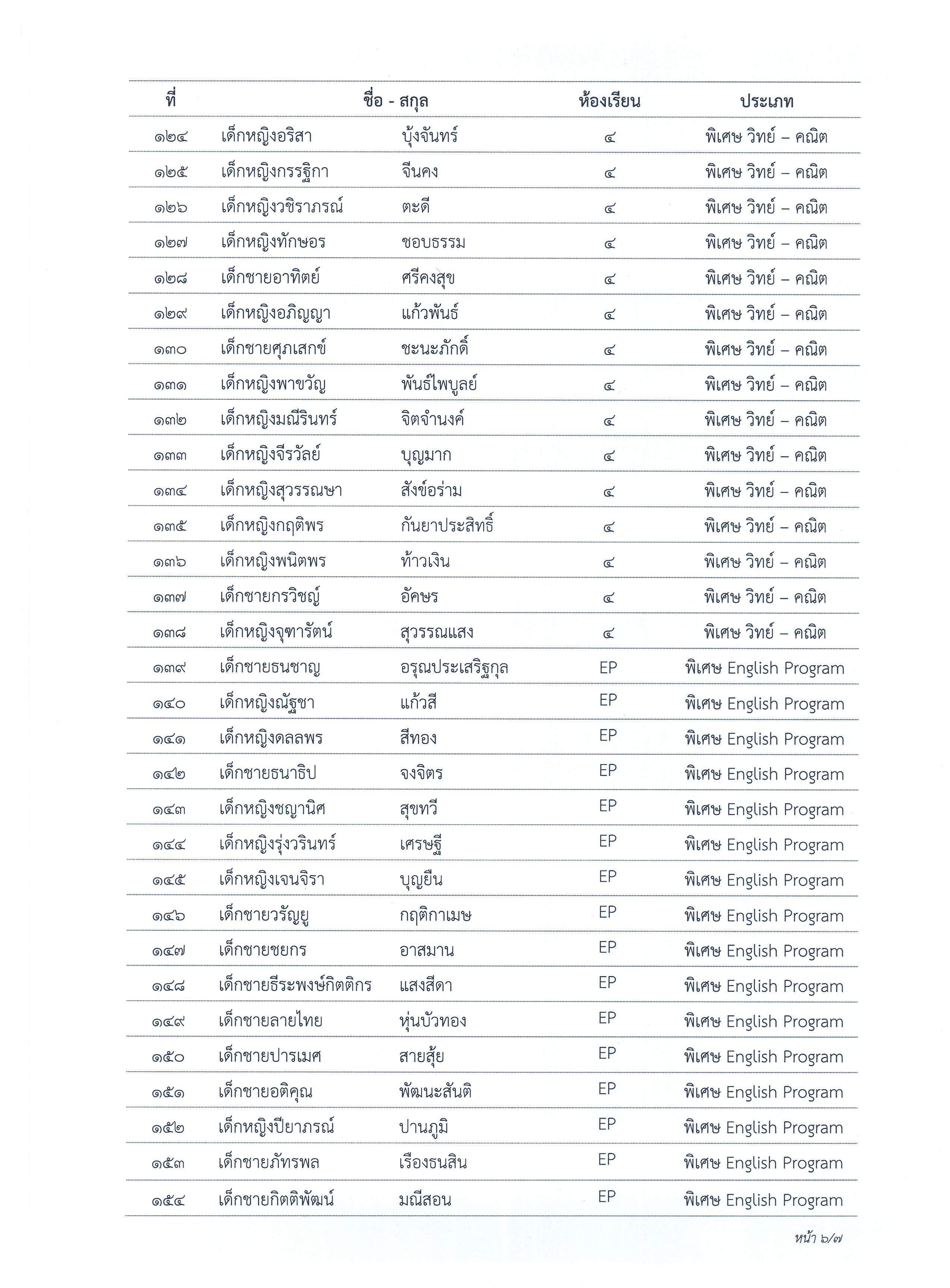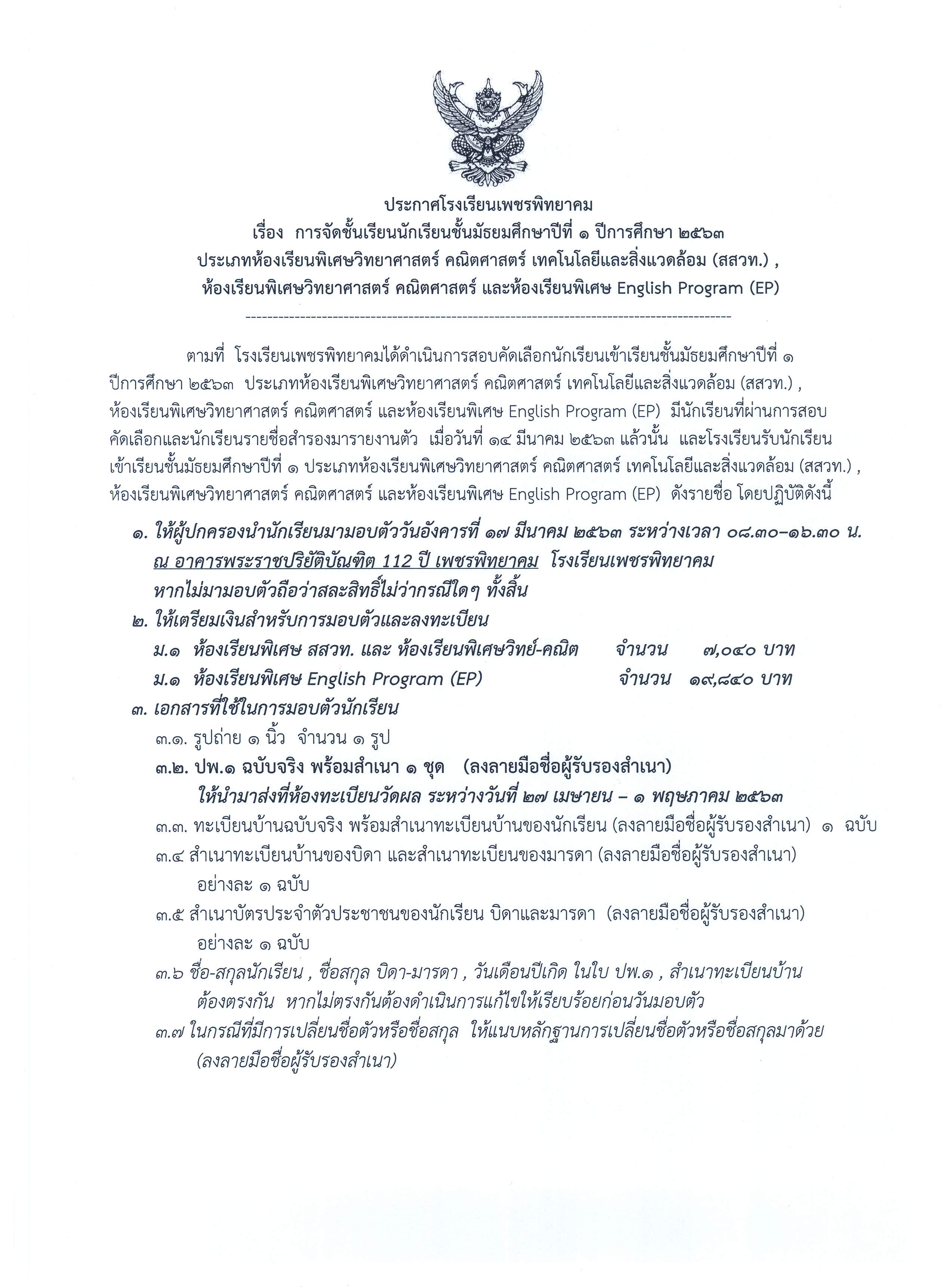 ประกาศผลการจัดชั้นเรียนนักเรียนชั้นมัธยมศึกษาปีที่ 1 ปีการศึกษา 2563 ประเภทห้องเรียนพิเศษ วิทย์-คณิต (สสวท.), วิทย์-คณิต และห้องเรียนพิเศษ English Progam (EP)