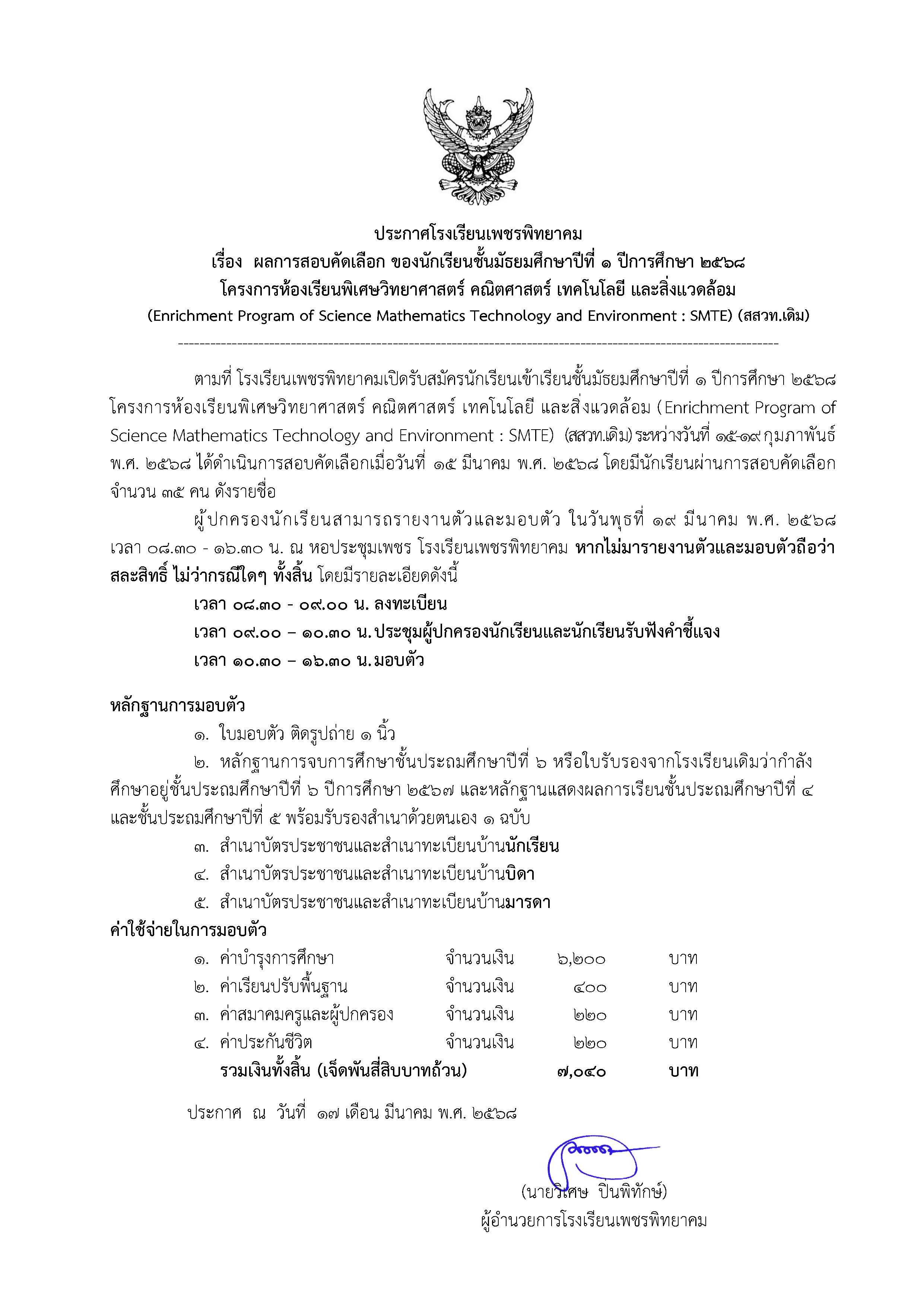 ประกาศผลการสอบคัดเลือก ของนักเรียนชั้นมัธยมศึกษาปีที่ 1 ปีการศึกษา 2568 โครงการห้องเรียนพิเศษวิทยาศาสตร์ คณิตศาสตร์ เทคโนโลยี และสิ่งแวดล้อม (Enrichment Program of Science Mathematics Technology and Environment : SMTE) (สสวท.เดิม)