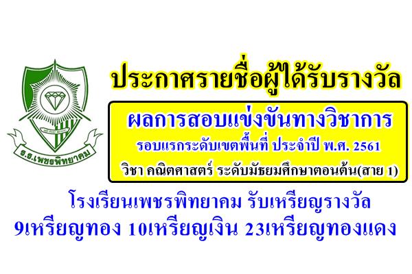 ผลการสอบแข่งขันทางวิชาการ รอบแรกระดับเขตพื้นที่ ประจำปี พ.ศ. 2561 วิชา คณิตศาสตร์ ระดับมัธยมศึกษาตอนต้น(สาย 1) โรงเรียนเพชรพิทยาคม รับ 9เหรียญทอง 10เหรียญเงิน 23เหรียญทองแดง
