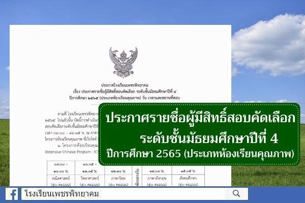 ประกาศโรงเรียนเพชรพิทยาคม เรื่อง ประกาศรายชื่อผู้มีสิทธิ์สอบคัดเลือก ระดับชั้นมัธยมศึกษาปีที่ 4 ปีการศึกษา 2565 (ประเภทห้องเรียนคุณภาพ) วัน เวลาและสถานที่สอบ