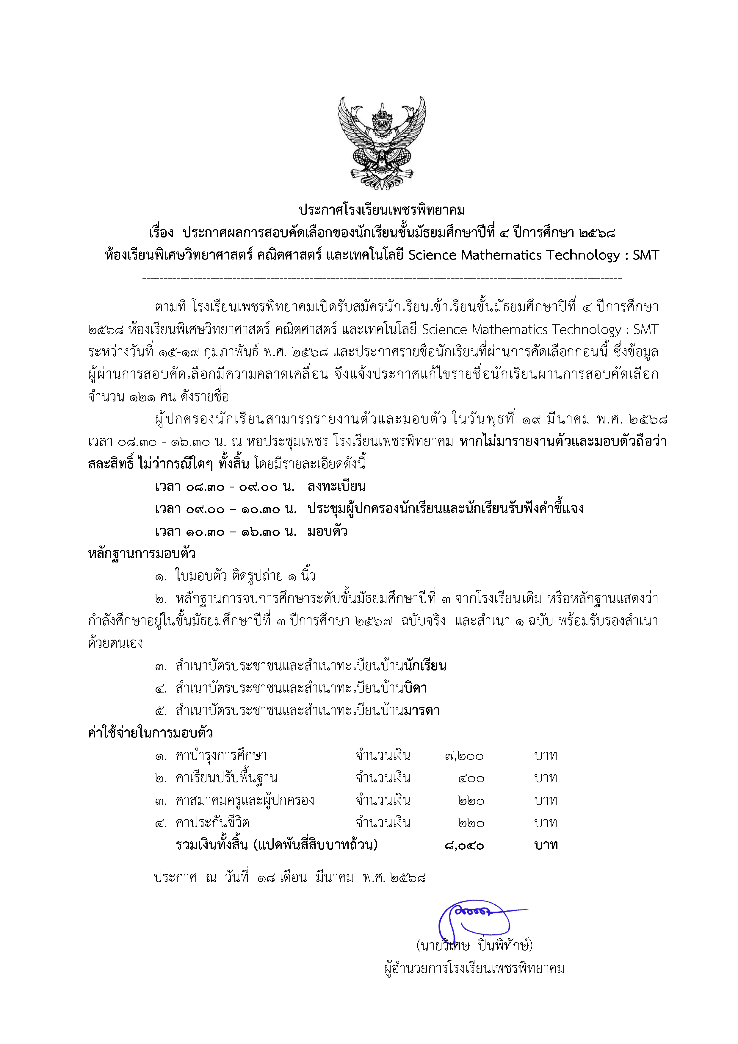 ประกาศผลการสอบคัดเลือกของนักเรียนชั้นมัธยมศึกษาปีที่ 4 ปีการศึกษา 2568 ห้องเรียนพิเศษวิทยาศาสตร์ คณิตศาสตร์ และเทคโนโลยี Science Mathematics Technology : SMT