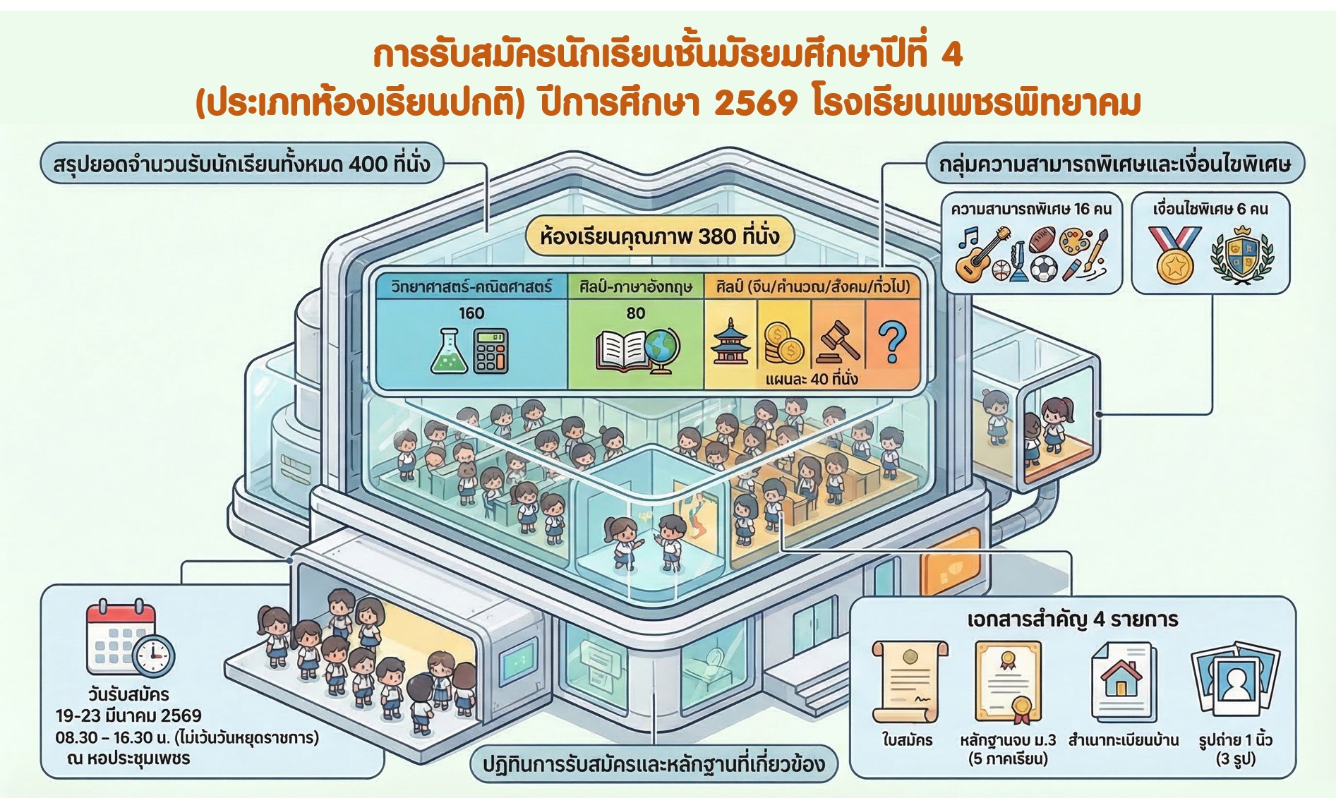โรงเรียนเพชรพิทยาคม ประกาศรับสมัครนักเรียนชั้น ม.4 ห้องเรียนปกติ ปี 2569 (รับ 400 ที่นั่ง) ระหว่างวันที่ 19-23 มีนาคม 2569 ณ หอประชุมเพชร
