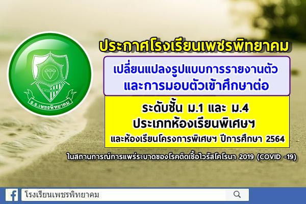 ประกาศโรงเรียนเพชรพิทยาคม เรื่อง เปลี่ยนแปลงรูปแบบการรายงานตัวและการมอบตัวเข้าศึกษาต่อระดับชั้นมัธยมศึกษาปีที่ 1 และชั้นมัธยมศึกษาปีที่ 4 ห้องเรียนพิเศษฯ ปีการศึกษา 2564