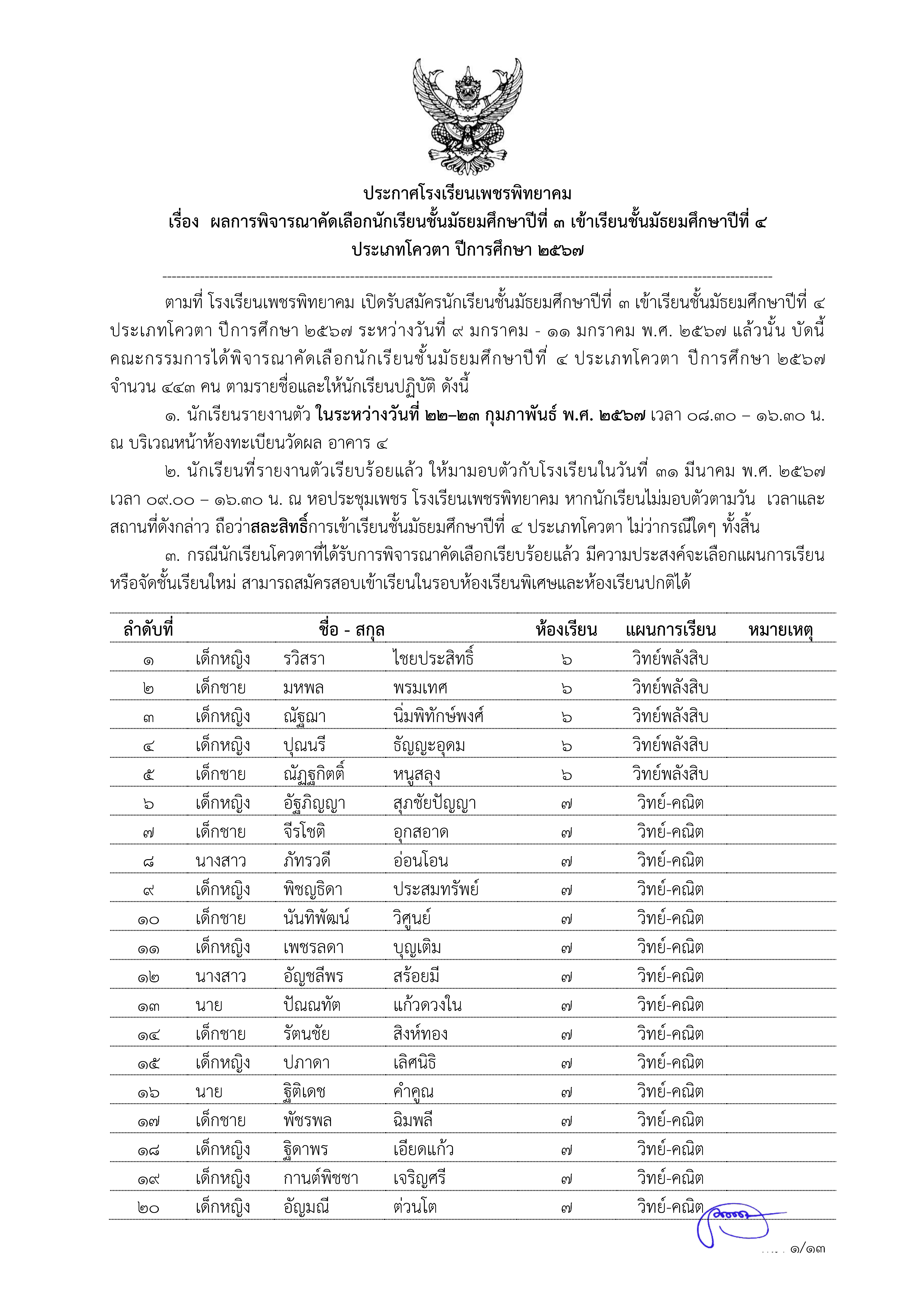 ตามที่ โรงเรียนเพชรพิทยาคม เปิดรับสมัครนักเรียนชั้นมัธยมศึกษาปีที่ ๓ เข้าเรียนชั้นมัธยมศึกษาปีที่ ๔ ประเภทโควตา ปีการศึกษา ๒๕๖๗ ระหว่างวันที่ ๙ มกราคม - ๑๑ มกราคม พ.ศ. ๒๕๖๗ แล้วนั้น บัดนี้ คณะกรรมการได้พิจารณาคัดเลือกนักเรียนชั้นมัธยมศึกษาปีที่ ๔ ประเภทโควตา ปีการศึกษา ๒๕๖๗ จำนวน ๔๔๓ คน ตามรายชื่อและให้นักเรียนปฏิบัติ ดังนี้