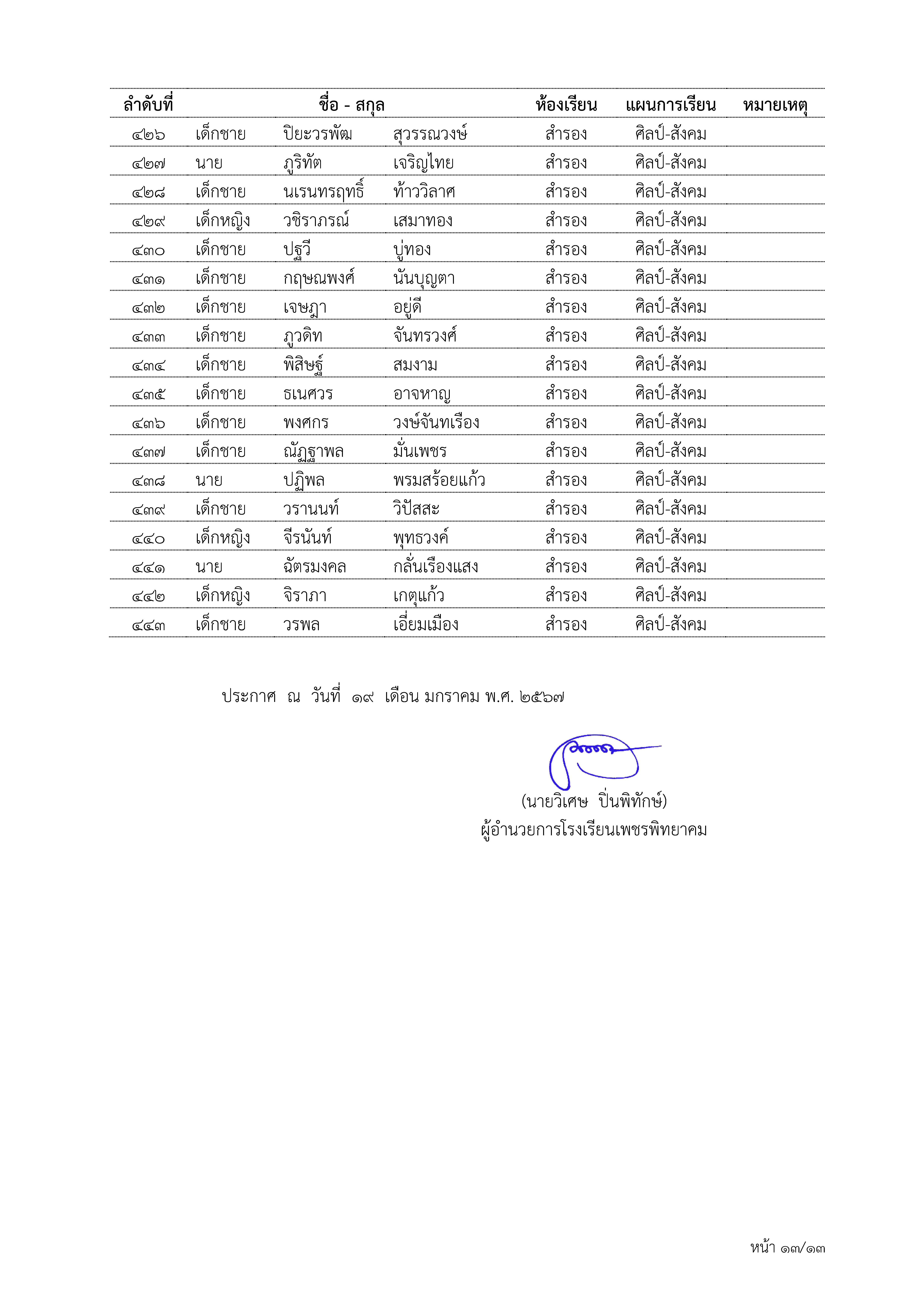 ประกาศโรงเรียนเพชรพิทยาคม