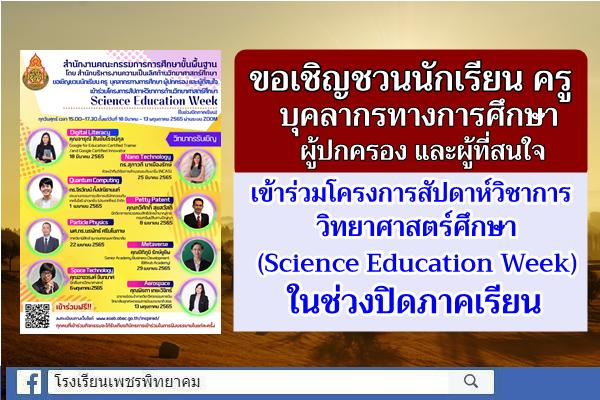 ขอเชิญชวนนักเรียน ครู บุคลากรทางการศึกษา ผู้ปกครอง และผู้ที่สนใจเข้าร่วมโครงการสัปดาห์วิชาการวิทยาศาสตร์ศึกษา (Science Education Week) ในช่วงปิดภาคเรียน โดยการเข้าร่วมกิจกรรมบรรยายทางด้านวิทยาศาสตร์ เทคโนโลยี และนวัตกรรมผ่านระบบออนไลน์ จากวิทยากรที่มีความรู้ความเชี่ยวชาญในแต่ละด้านผ่านระบบออนไลน์ เพื่อส่งเสริมให้นักเรียนและผู้สนใจได้เข้ารับฟังการบรรยายทางด้านวิทยาศาสตร์และได้รับการสร้างแรงบันดาลใจในการเรียนและการประกอบอาชีพทางด้านวิทยาศาสตร์ จัดกิจกรรมทุกวันศุกร์เวลา 15.00 น. – 17.30 น.ตั้งแต่วันที่ 18 มีนาคม – 13 พฤษภาคม 2565 ผ่านระบบออนไลน์ซึ่งเปิดโอกาสให้นักเรียน ครู ผู้บริหาร ผู้ปกครอง ผู้สนใจ ทุกสังกัดเข้าร่วมกิจกรรมกิจกรรมฟรีตามความสนใจลงทะเบียนทางเว็บไซต์ http://www.eseb.obec.go.th/inspired/ พร้อมรับเกียรติบัตรจากการเข้าร่วมกิจกรรม