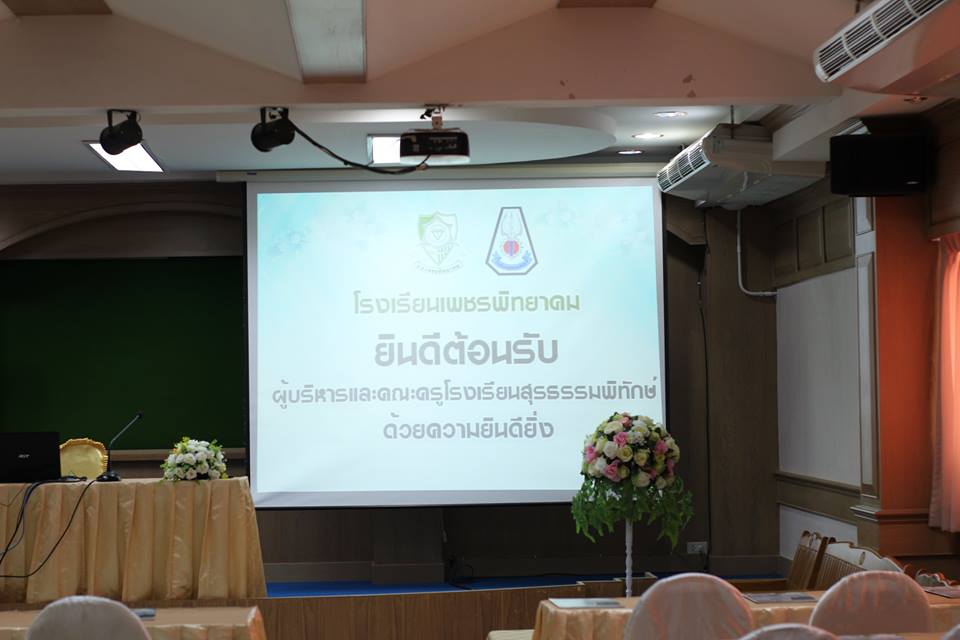 นายนิรุทธ์ แก้วนิคม รองผู้อำนวยการโรงเรียนพร้อมด้วยฝ่ายบริหารและคณะครู ร่วมต้อนรับคณะศึกษาดูงานจากโรงเรียนสุรธรรมพิทักษ์ ที่มาศึกษาดูงาน เกี่ยวกับการดำเนินงาน OBECQA และการจัดการเรียนการสอนโครงการส่งเสริมศักยภาพด้านวิทยาศาสตร์ - คณิตศาสตร์ เทคโนโลยีและสิ่งแวดล้อม (สสวท.) เมื่อวันที่ 18 กันยายน 2560 ณ ห้องโสตทัศนศึกษา โรงเรียนเพชรพิทยาคม