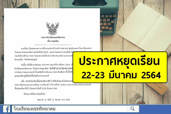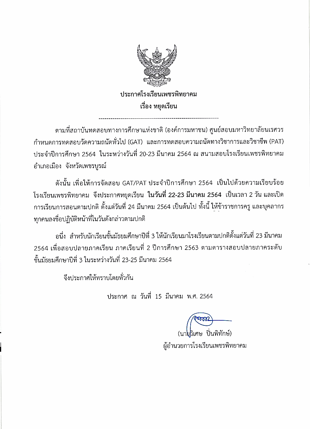 ดังนั้น เพื่อให้การจัดสอบ GAT/PAT ประจำปีการศึกษา 2563 เป็นไปด้วยความเรียบร้อย โรงเรียนเพชรพิทยาคม จึงประกาศหยุดเรียน ในวันที่ 22-23 มีนาคม 2564 เป็นเวลา 2 วัน และเปิด
