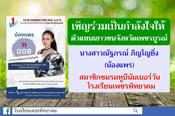 เชิญร่วมเป็นกำลังใจให้กับตัวแทนเยาวชนจังหวัดเพชรบูรณ์ นางสาวณัฐภรณ์ ภิญโญยิ่ง (น้องแพร) สมาชิกชมรมทูบีนัมเบอร์วัน โรงเรียนเพชรพิทยาคม ในการประกวดเยาวชนต้นแบบเก่งและดี TO BE NUMBER ONE IDOL 12 รอบคัดเลือกระดับภาคเหนือ ในวันเสาร์ ที่ 26 มีนาคม 2565 ณ จังหวัดเชียงใหม่ ร่วมส่งกำลังใจด้วยการโหวต 1900-1900-94 กดโทรออก กด 3 (ภาคเหนือ) ตามด้วย 008 ตั้งแต่วันนี้ ถึงวันเสาร์ ที่ 26 มีนาคม 2565 เวลา 15.00 น.