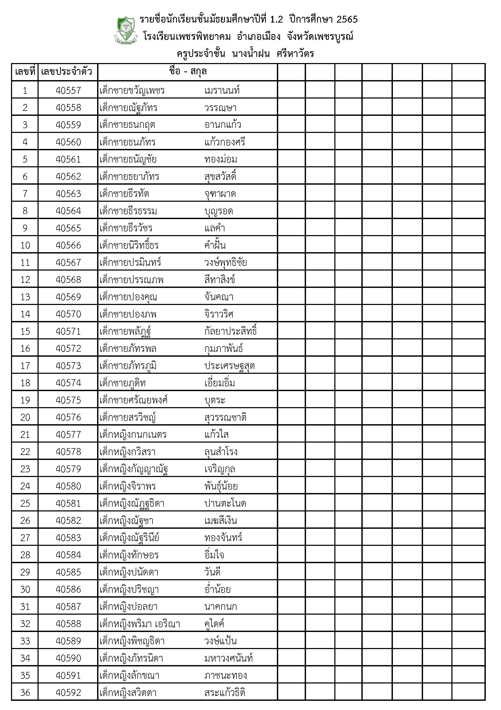 รายชื่อนักเรียนชั้นมัธยมศึกษาปีที่ 1.2 ปีการศึกษา 2565 โรงเรียนเพชรพิทยาคม