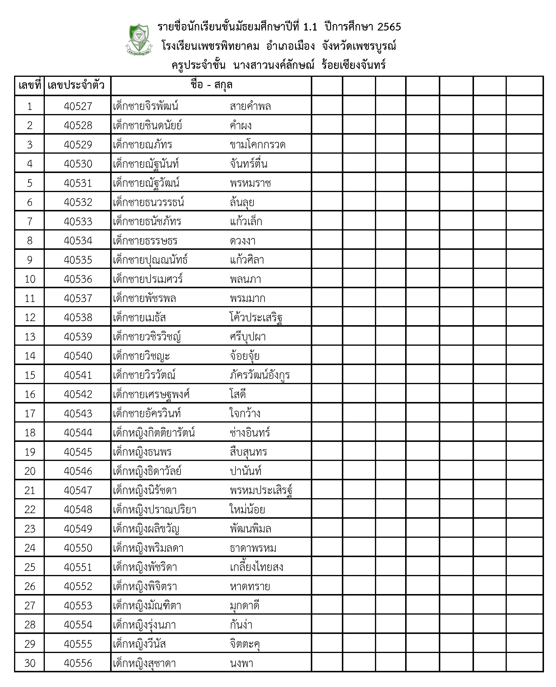 รายชื่อนักเรียนชั้นมัธยมศึกษาปีที่ 1.1 ปีการศึกษา 2565 โรงเรียนเพชรพิทยาคม