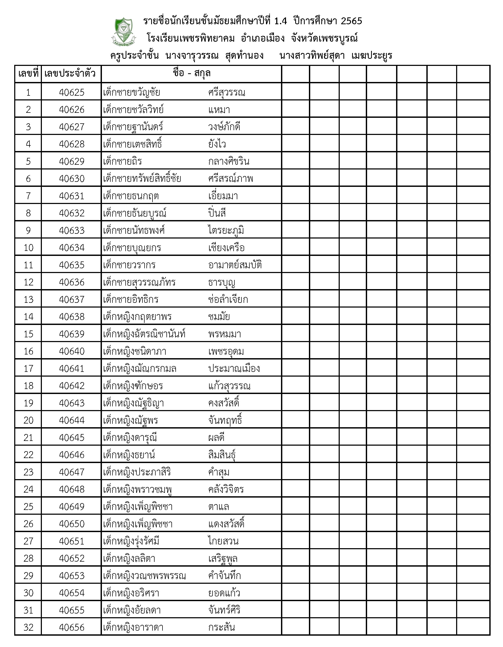 รายชื่อนักเรียนชั้นมัธยมศึกษาปีที่ 1.4 ปีการศึกษา 2565 โรงเรียนเพชรพิทยาคม