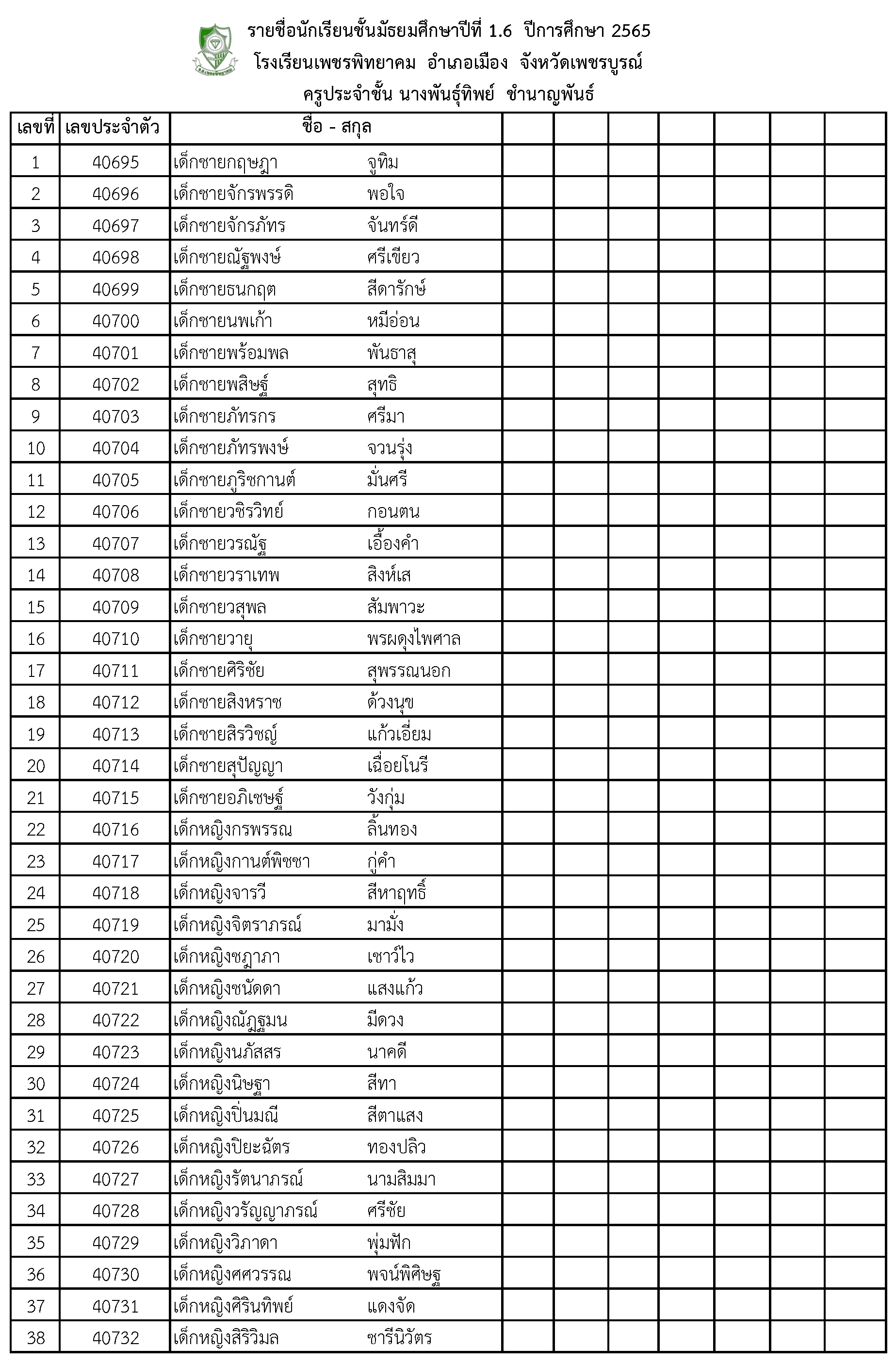 รายชื่อนักเรียนชั้นมัธยมศึกษาปีที่ 1.6 ปีการศึกษา 2565 โรงเรียนเพชรพิทยาคม