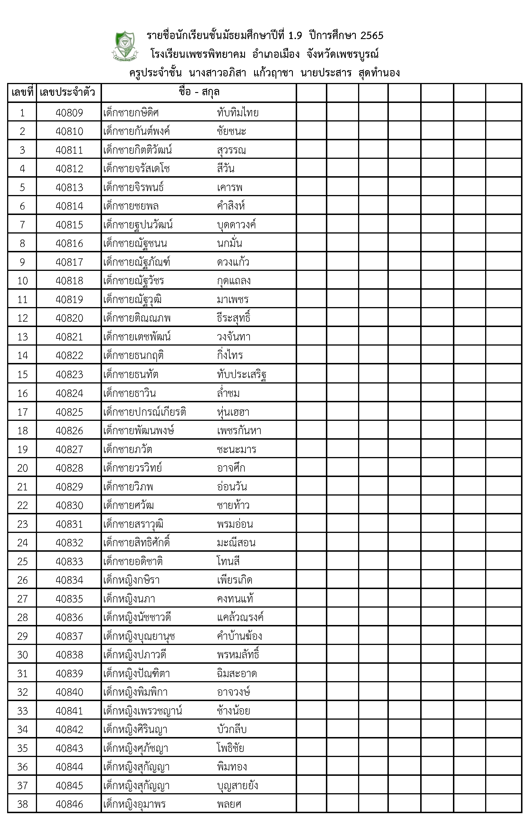 รายชื่อนักเรียนชั้นมัธยมศึกษาปีที่ 1.9 ปีการศึกษา 2565 โรงเรียนเพชรพิทยาคม