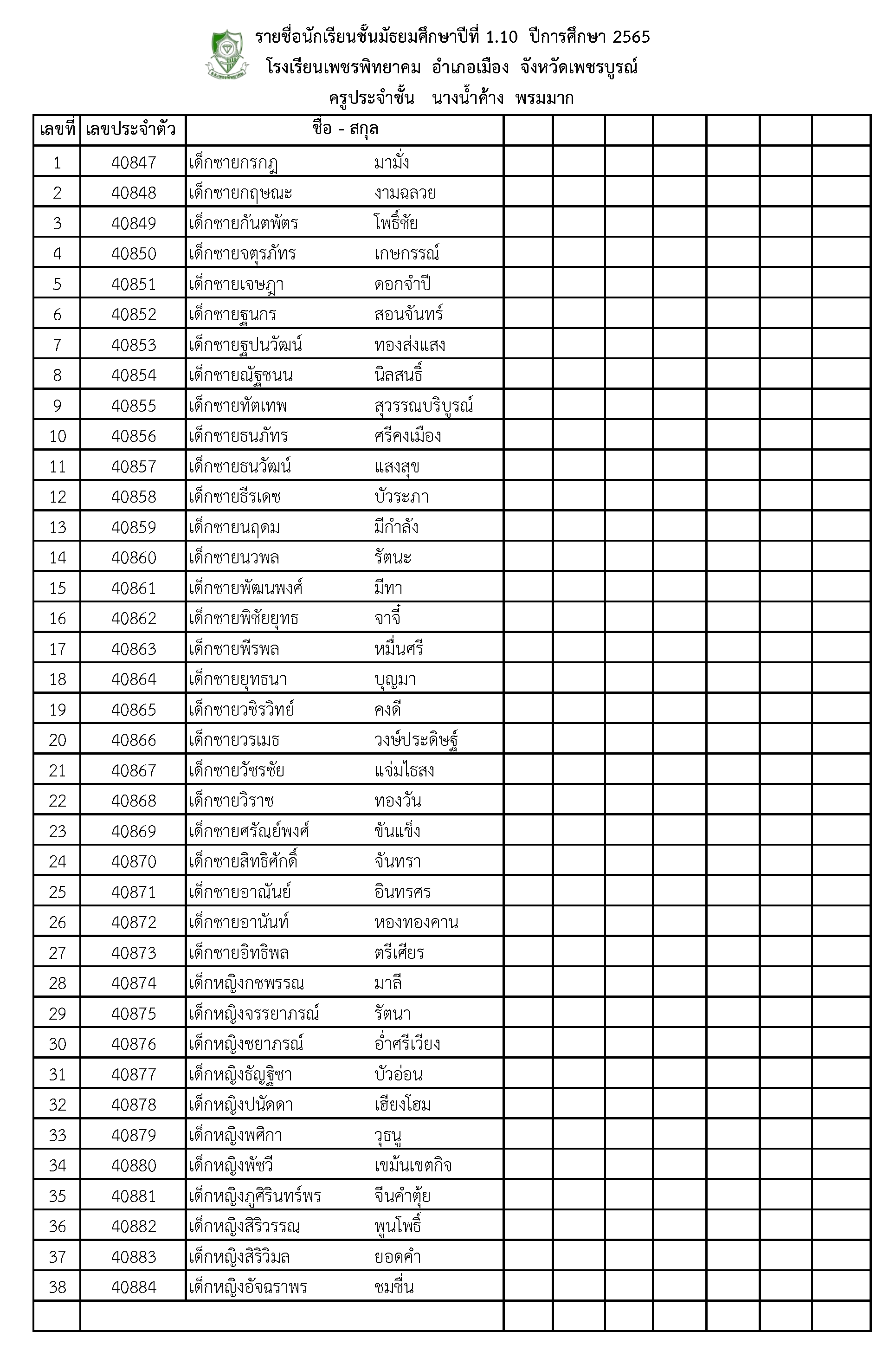 รายชื่อนักเรียนชั้นมัธยมศึกษาปีที่ 1.10 ปีการศึกษา 2565 โรงเรียนเพชรพิทยาคม
