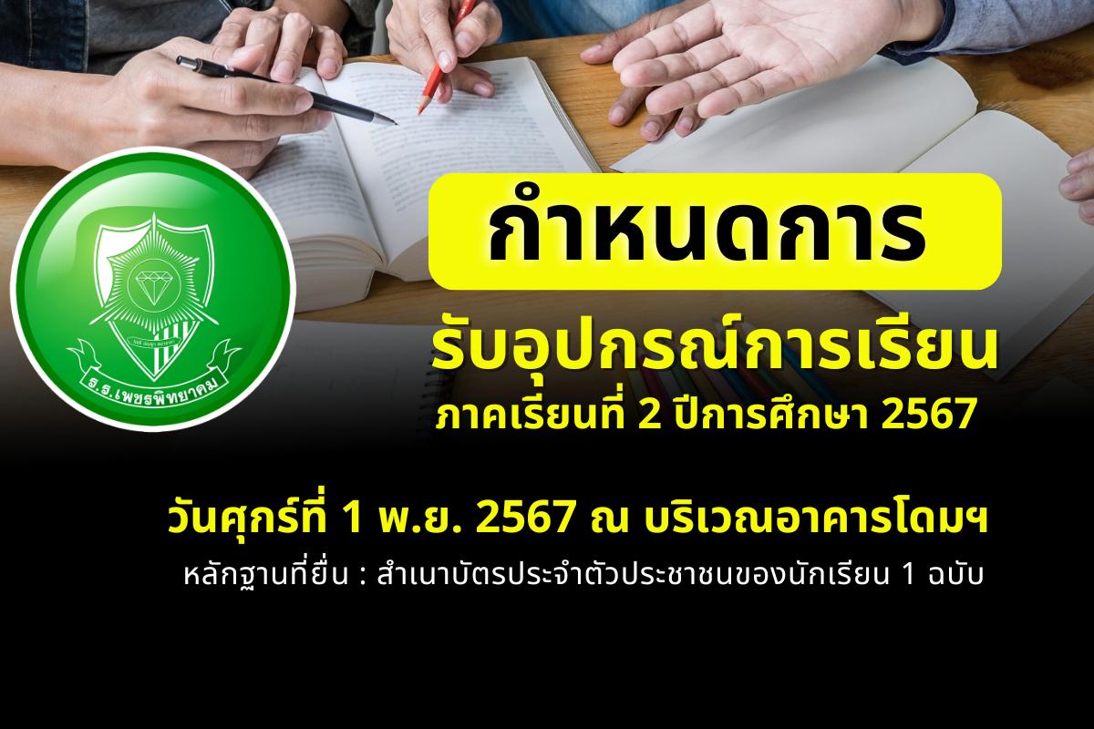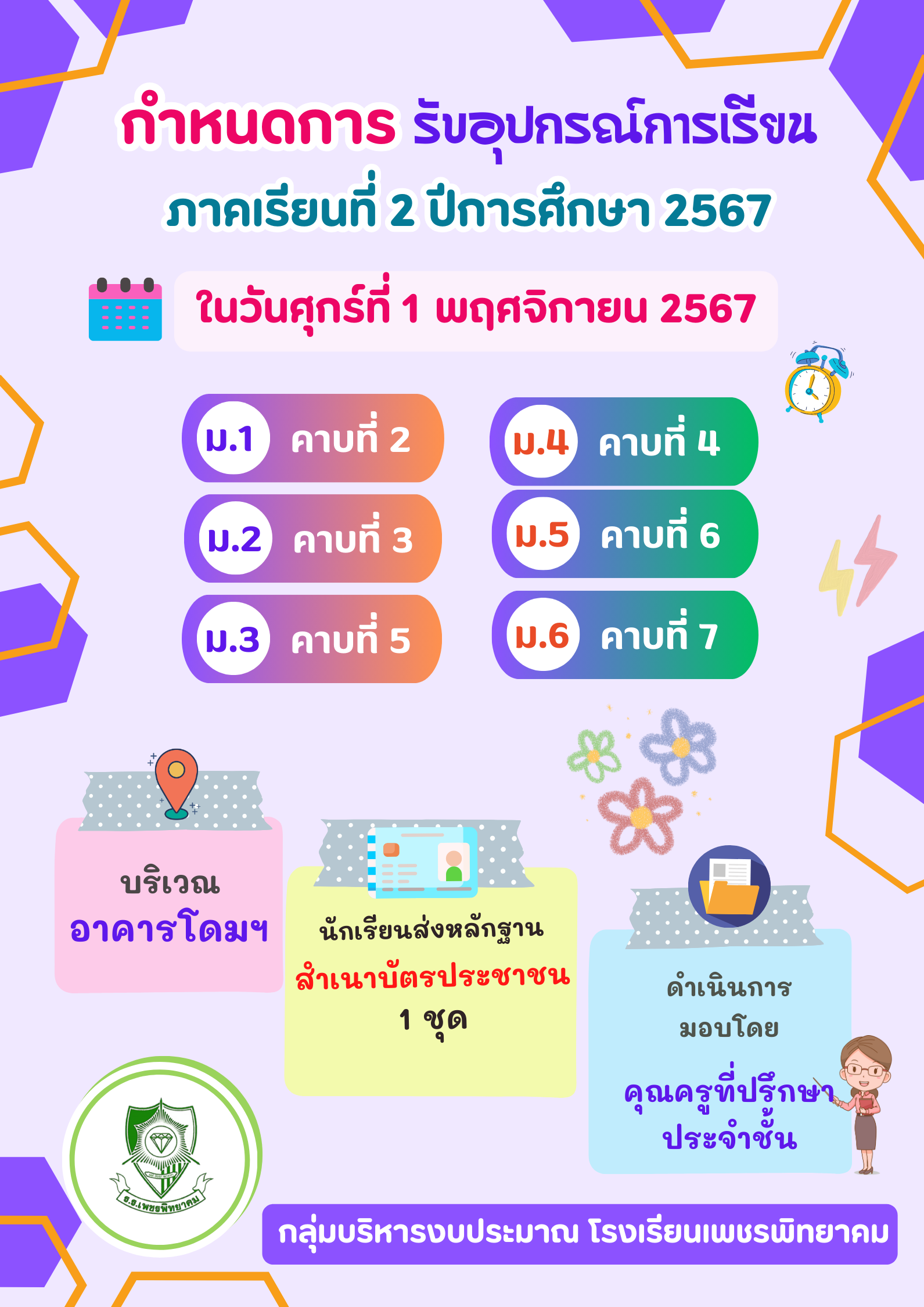กลุ่มบริหารงบประมาณ โรงเรียนเพชรพิทยาคม แจ้งประชาสัมพันธ์ กำหนดการรับอุปกรณ์การเรียน ภาคเรียนที่ 2 ปีการศึกษา 2567