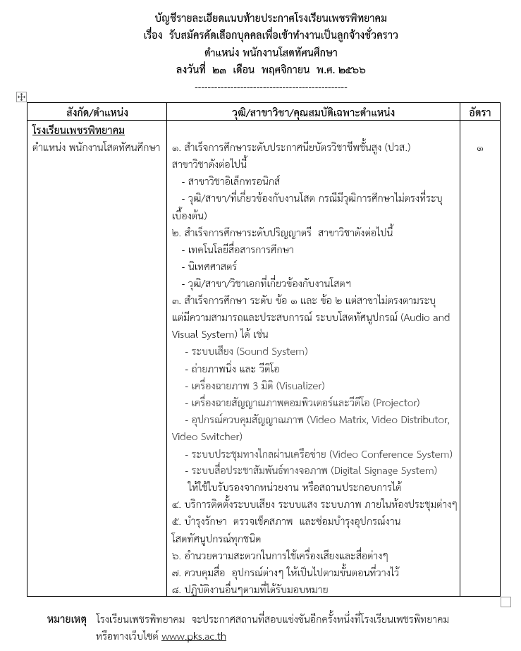 ประกาศโรงเรียนเพชรพิทยาคม เรื่อง รับสมัครสอบคัดเลือกบุคคลเพื่อเข้าทำงานเป็นลูกจ้างชั่วคราว ตำแหน่ง พนักงานโสตทัศนศึกษา
