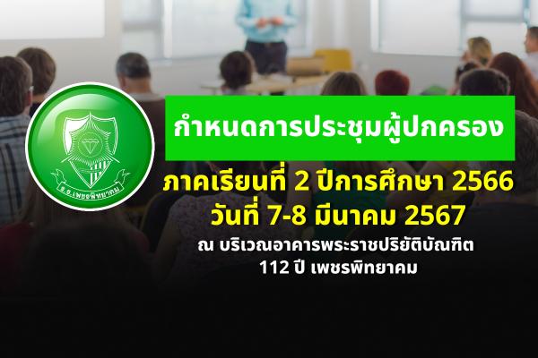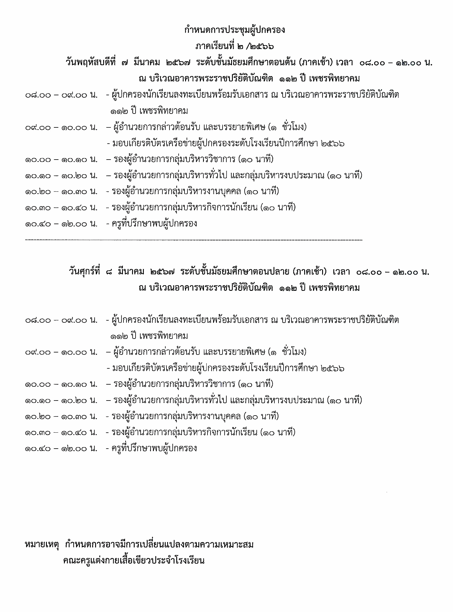 กำหนดการประชุมผู้ปกครองนักเรียน ภาคเรียนที่ 2 ปีการศึกษา 2566 วันที่ 7-8 มีนาคม 2567 ณ บริเวณอาคารพระราชปริยัติบัณฑิต 112 ปี เพชรพิทยาคม