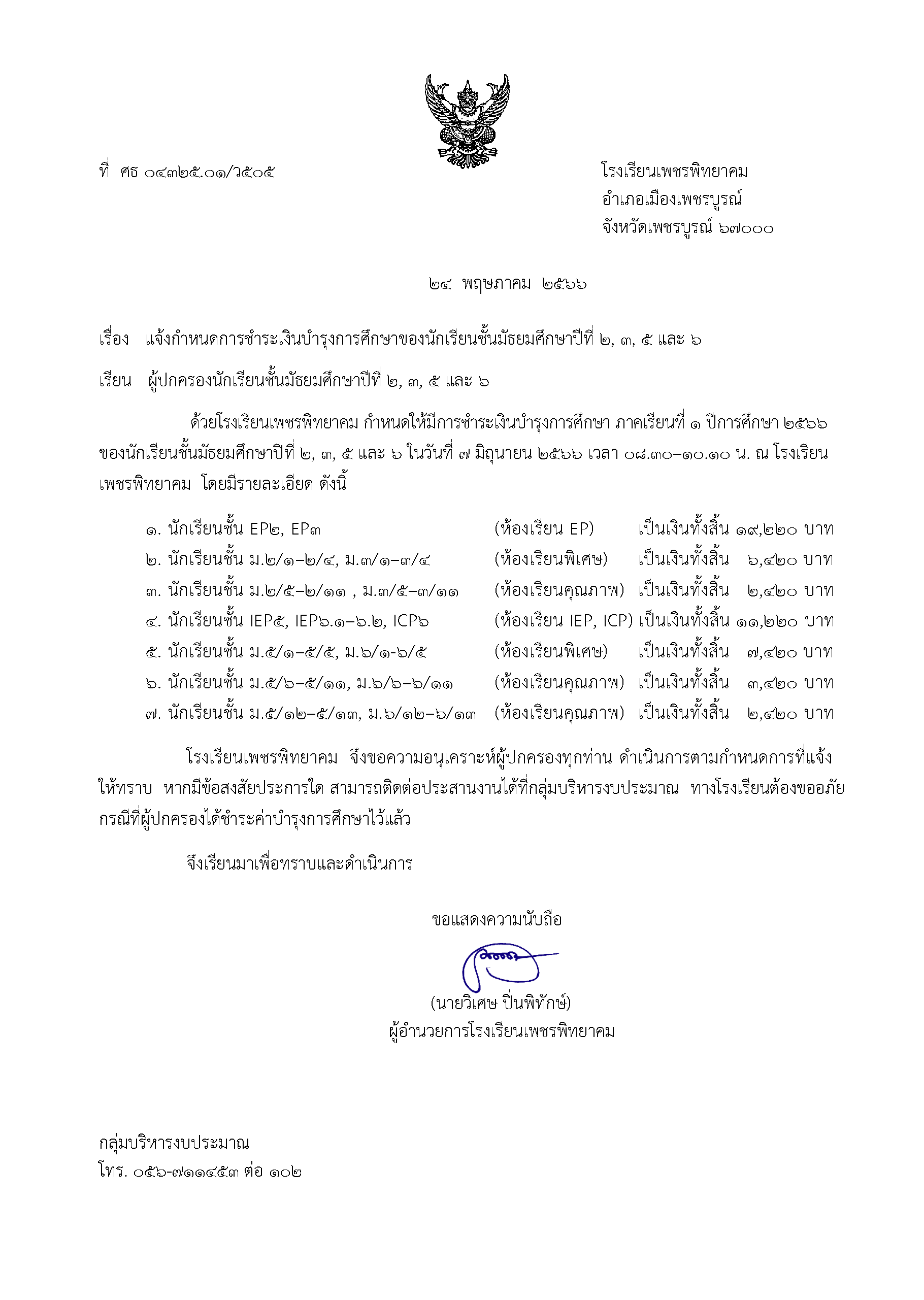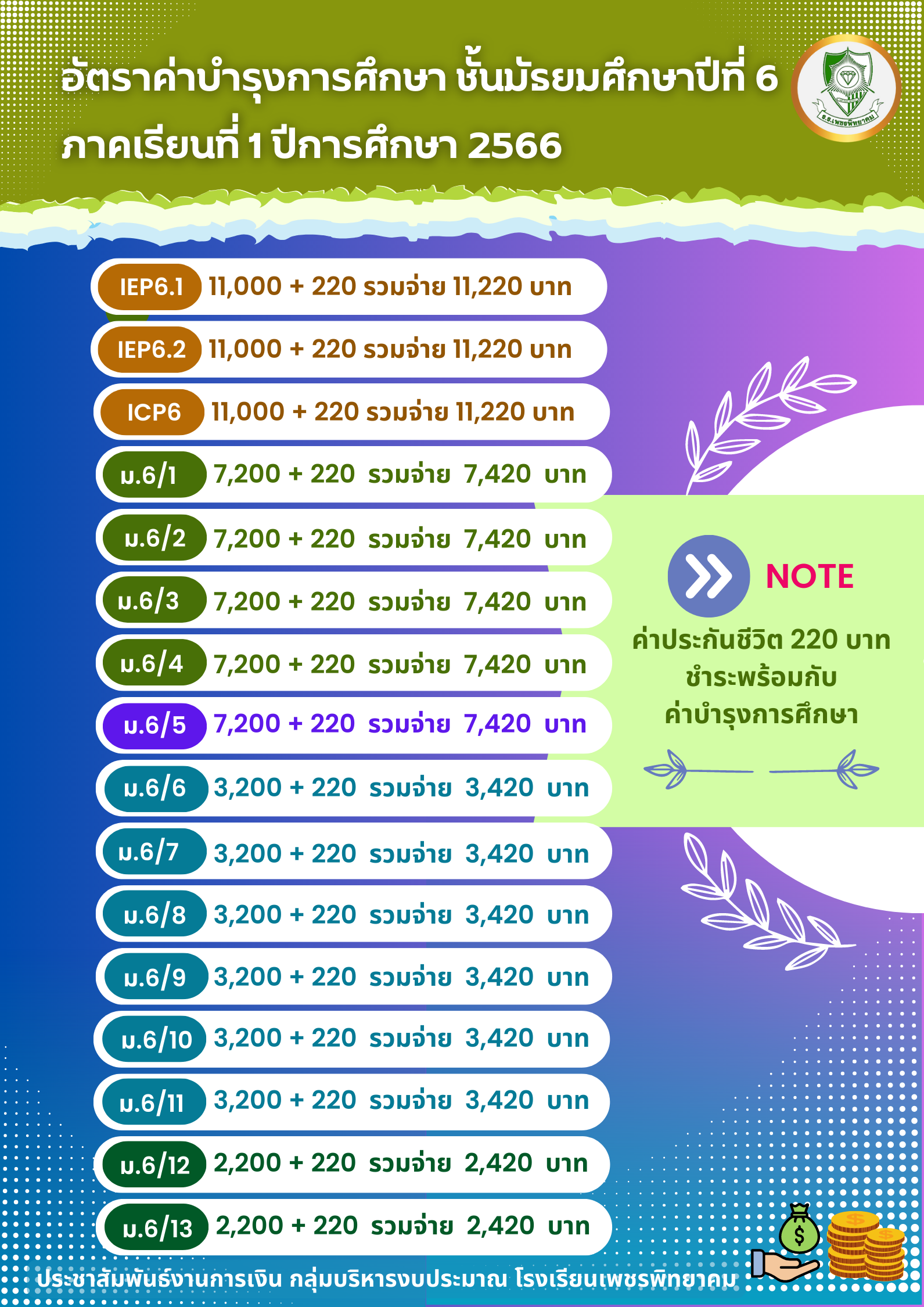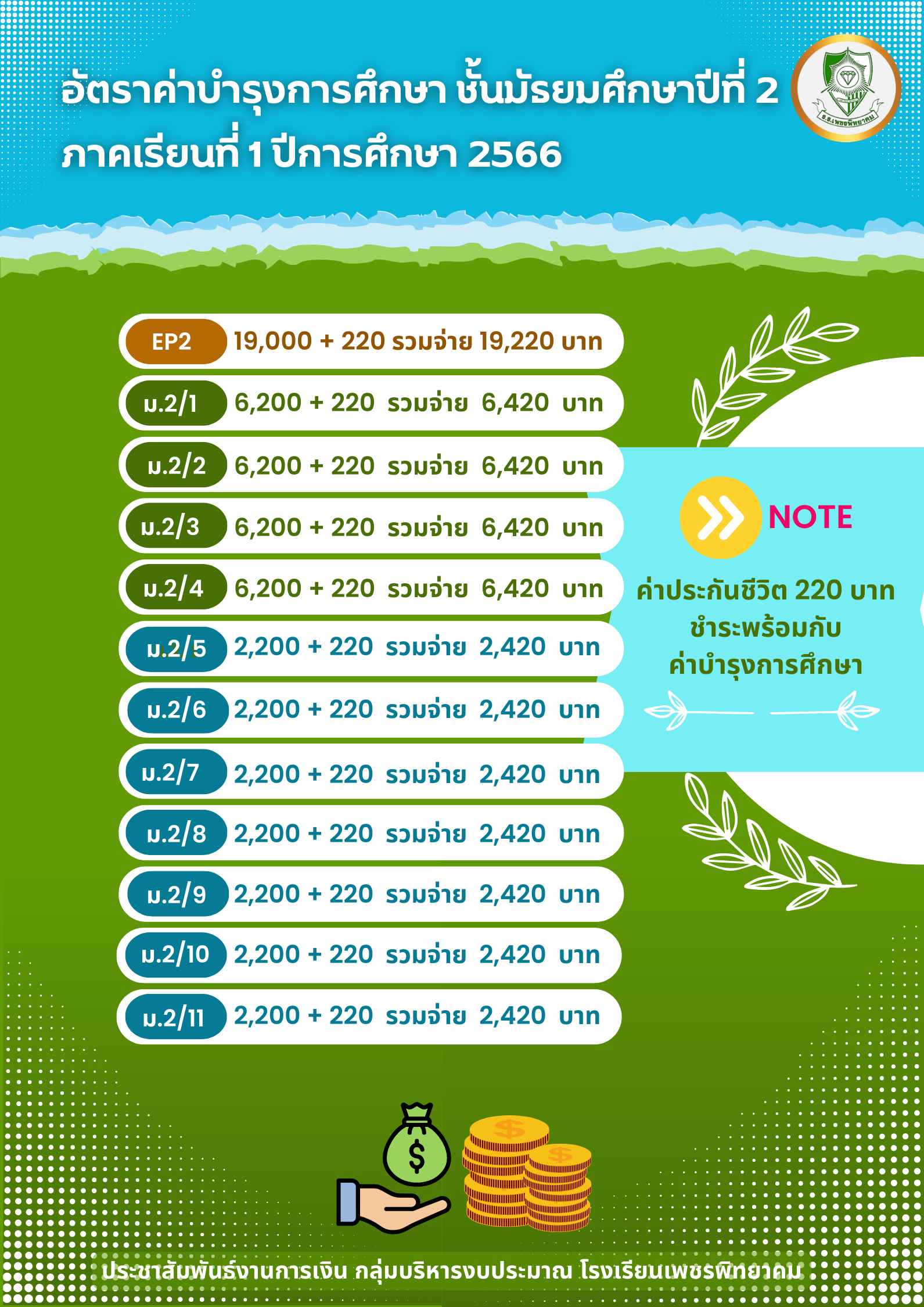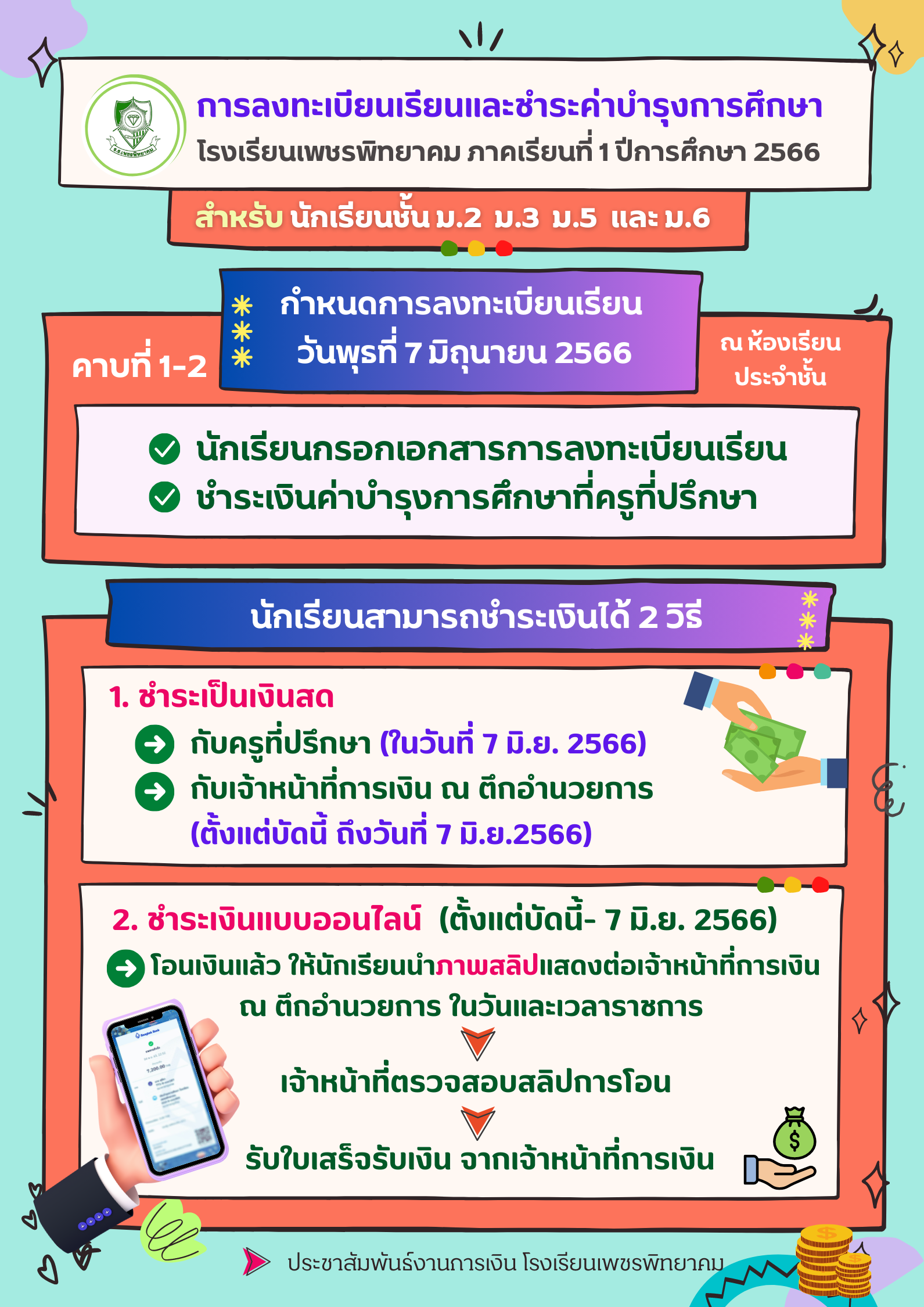 ประชาสัมพันธ์ แจ้งกำหนดการและวิธีการชำระค่าบำรุงการศึกษา นักเรียน ชั้น ม.2, ม.3, ม.5 และ ม.6 ประจำภาคเรียนที่ 1 ปีการศึกษา 2566