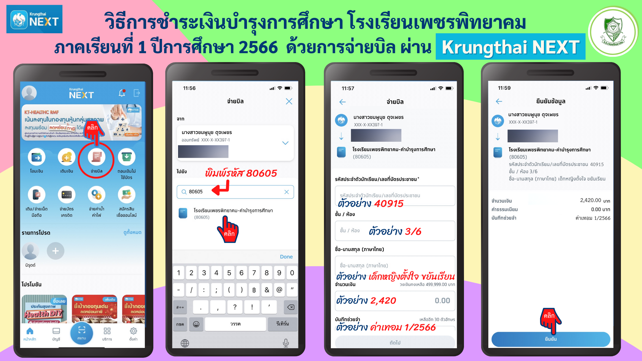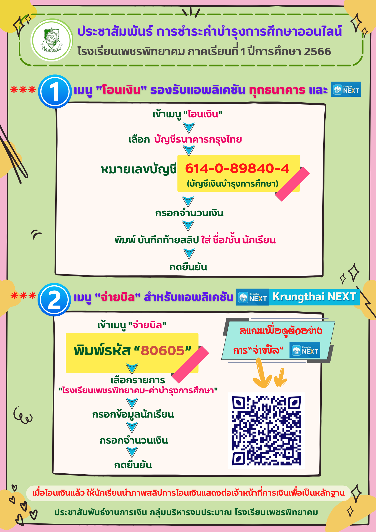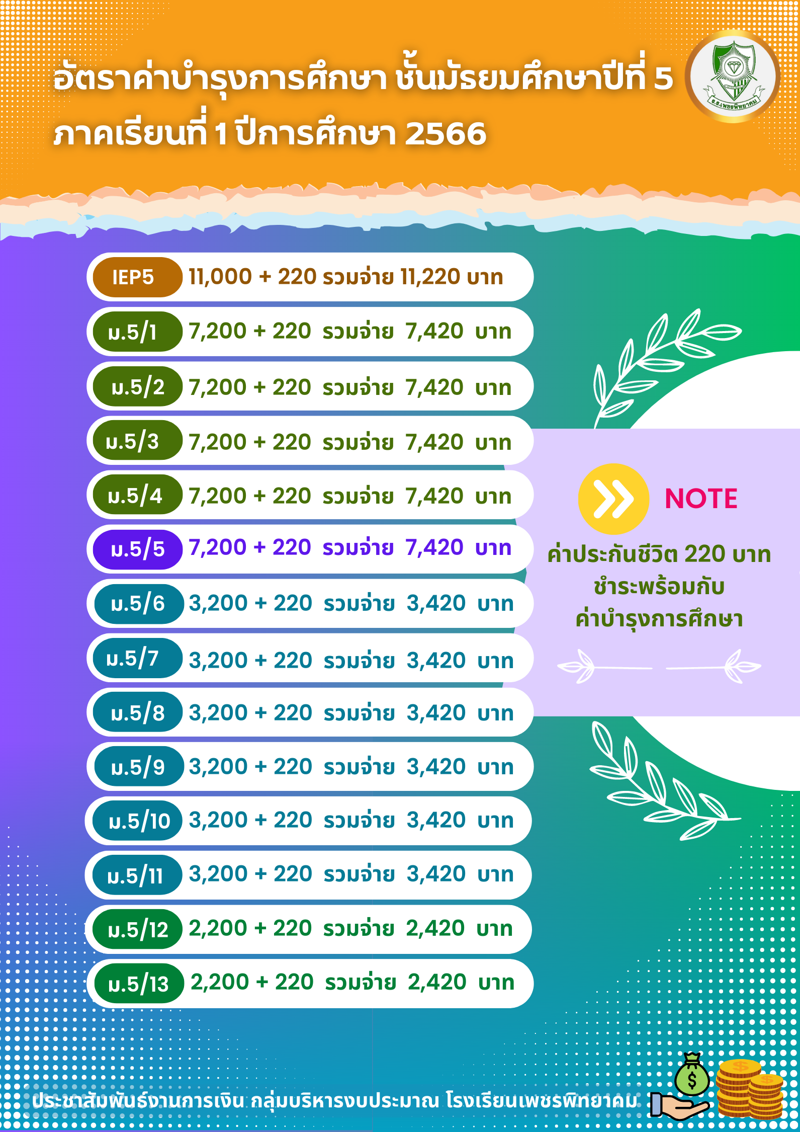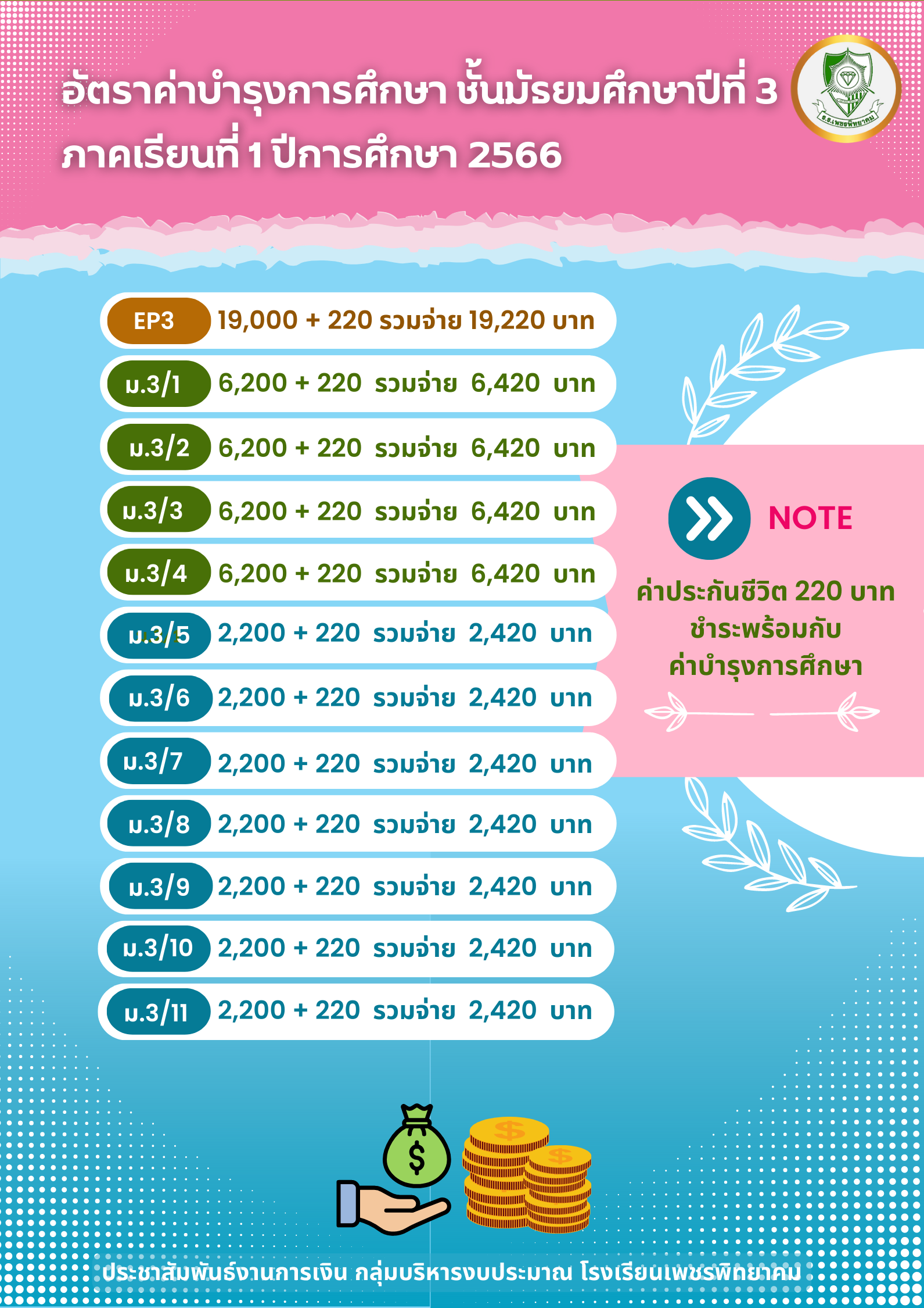 ประชาสัมพันธ์ แจ้งกำหนดการและวิธีการชำระค่าบำรุงการศึกษา นักเรียน ชั้น ม.2, ม.3, ม.5 และ ม.6 ประจำภาคเรียนที่ 1 ปีการศึกษา 2566