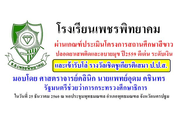 โรงเรียนเพชรพิทยาคม ผ่านเกณฑ์การประเมินเข้ารับโล่ รางวัลเชิดชูเกียรติเสมา ป.ป.ส. โครงการสถานศึกษาสีขาว ปลอดยาเสพติดและอบายมุข ปี2559