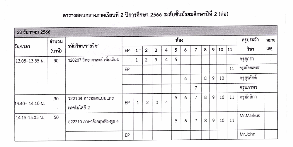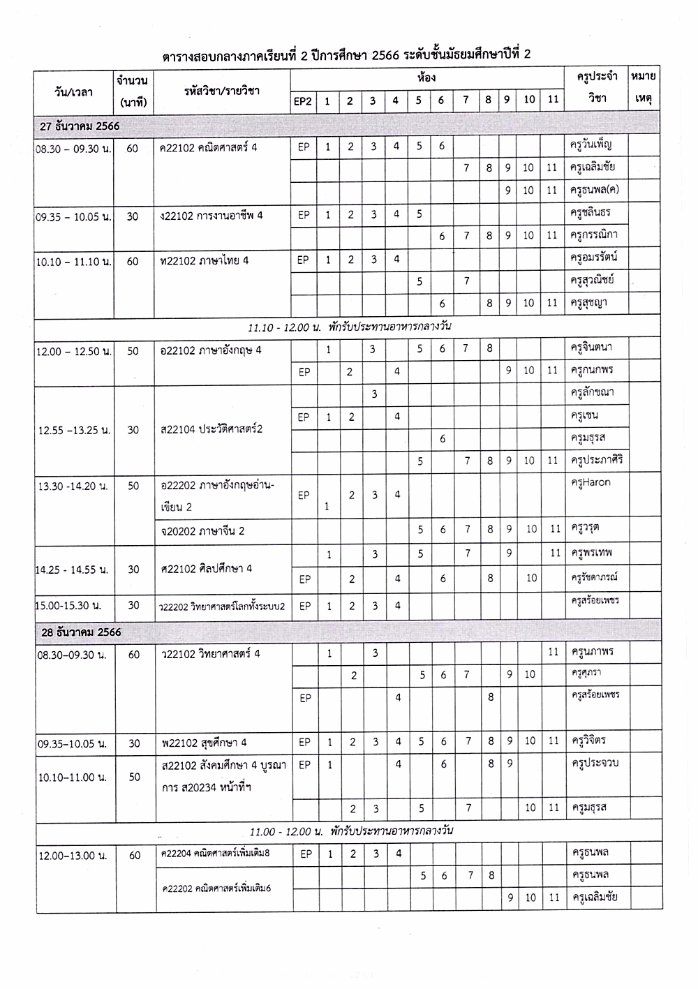 ตารางสอบกลางภาคเรียนที่ 2 ปีการศึกษา 2566 ระดับชั้นมัธยมศึกษาปีที่ 2 (วันที่ 27-28 ธันวาคม 2566)