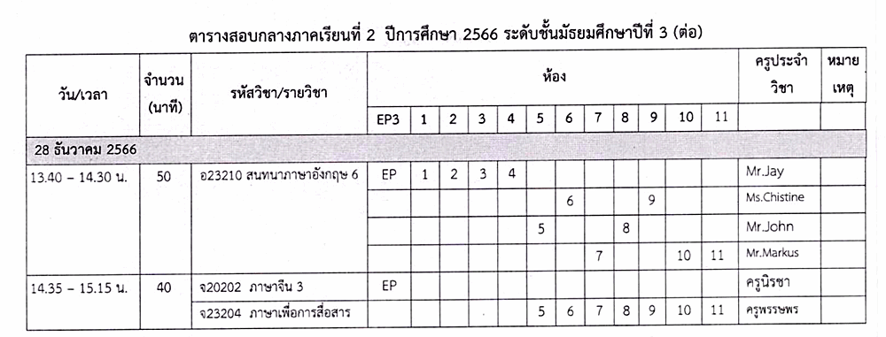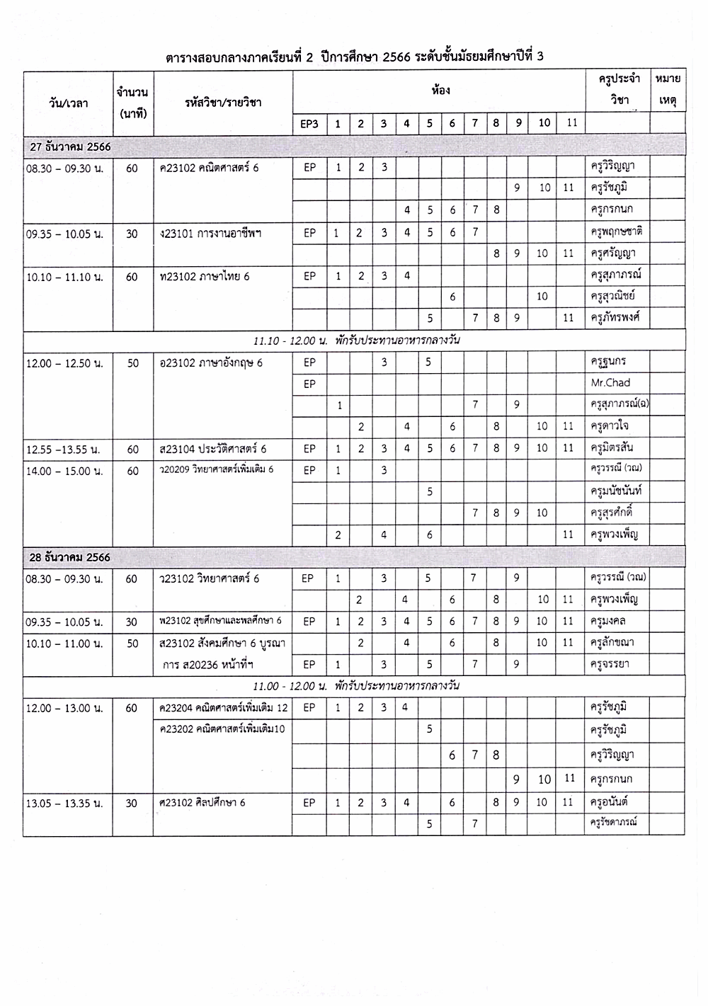 ตารางสอบกลางภาคเรียนที่ 2 ปีการศึกษา 2566 ระดับชั้นมัธยมศึกษาปีที่ 3 (วันที่ 27-28 ธันวาคม 2566)