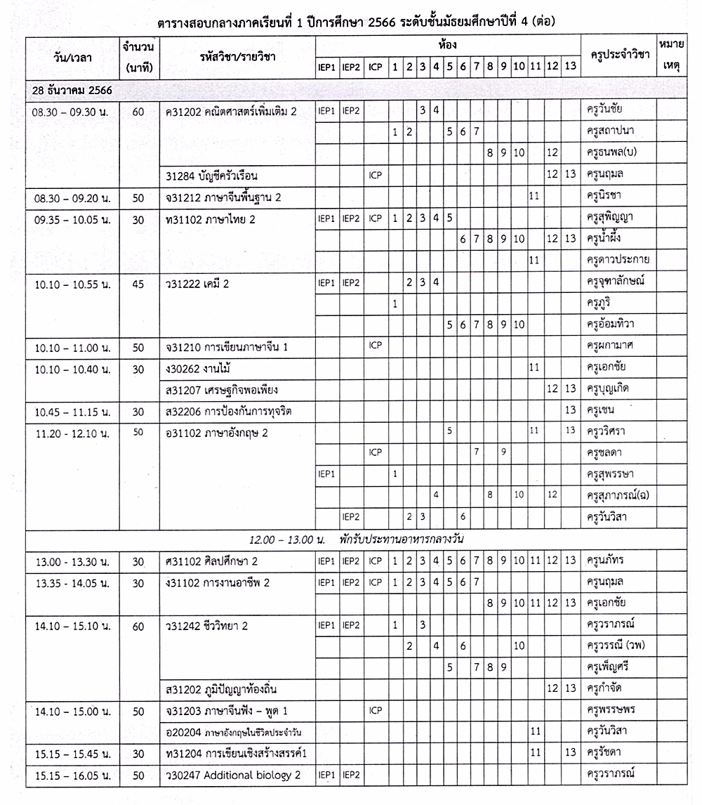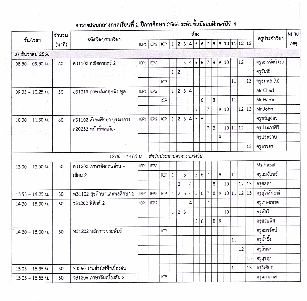 ตารางสอบกลางภาคเรียนที่ 2 ปีการศึกษา 2566 ระดับชั้นมัธยมศึกษาปีที่ 4 (วันที่ 27-28 ธันวาคม 2566)