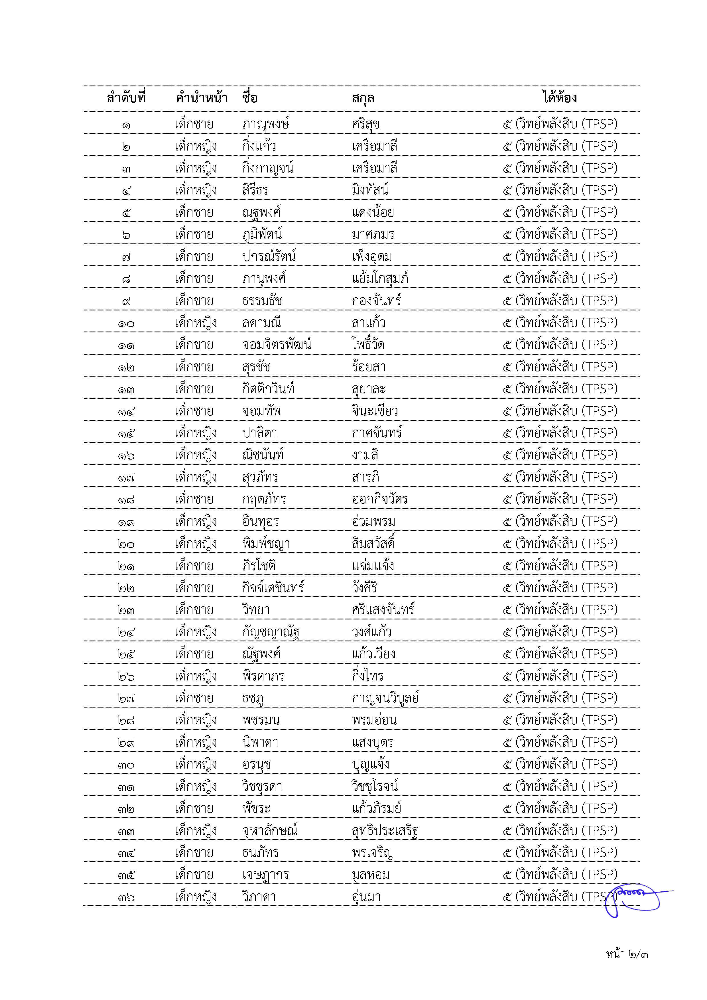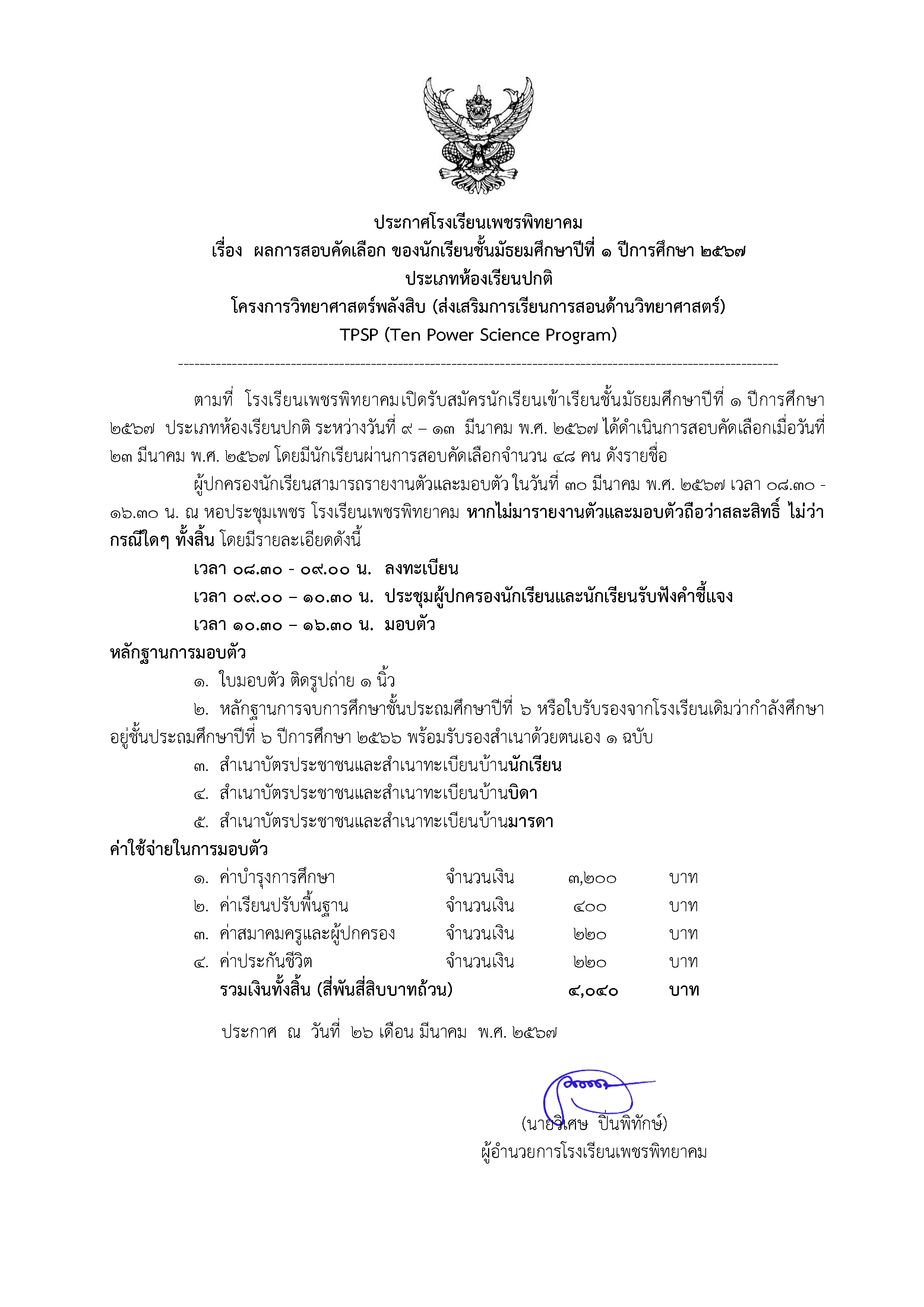 ประกาศโรงเรียนเพชรพิทยาคม เรื่อง ผลการสอบคัดเลือก ของนักเรียนชั้นมัธยมศึกษาปีที่ 1 ปีการศึกษา 2567 ประเภทห้องเรียนปกติ โครงการวิทยาศาสตร์พลังสิบ (ส่งเสริมการเรียนการสอนด้านวิทยาศาสตร์) TPSP (Ten Power Science Program)