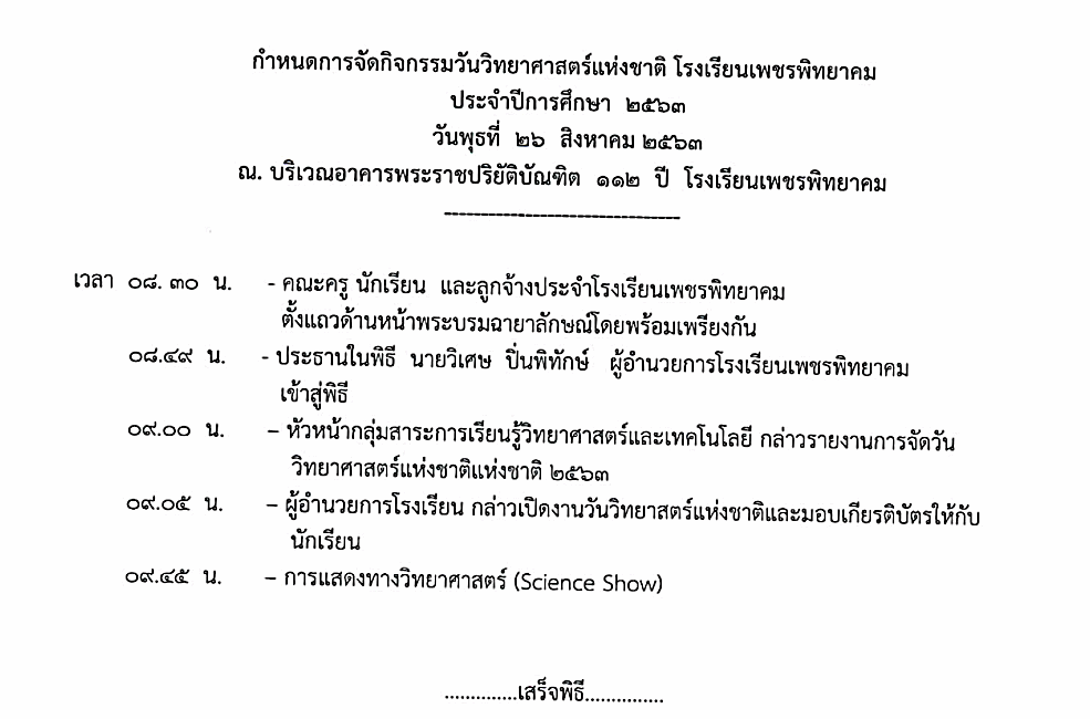 โรงเรียนเพชรพิทยาคม จัดกิจกรรมวันวิทยาศาสตร์ ประจำปีการศึกษา 2563 วันพุธที่ 26 สิงหาคม 2563 ณ บริเวณอาคารพระราชปริยัติบัณฑิต 112 ปี โรงเรียนเพชรพิทยาคม