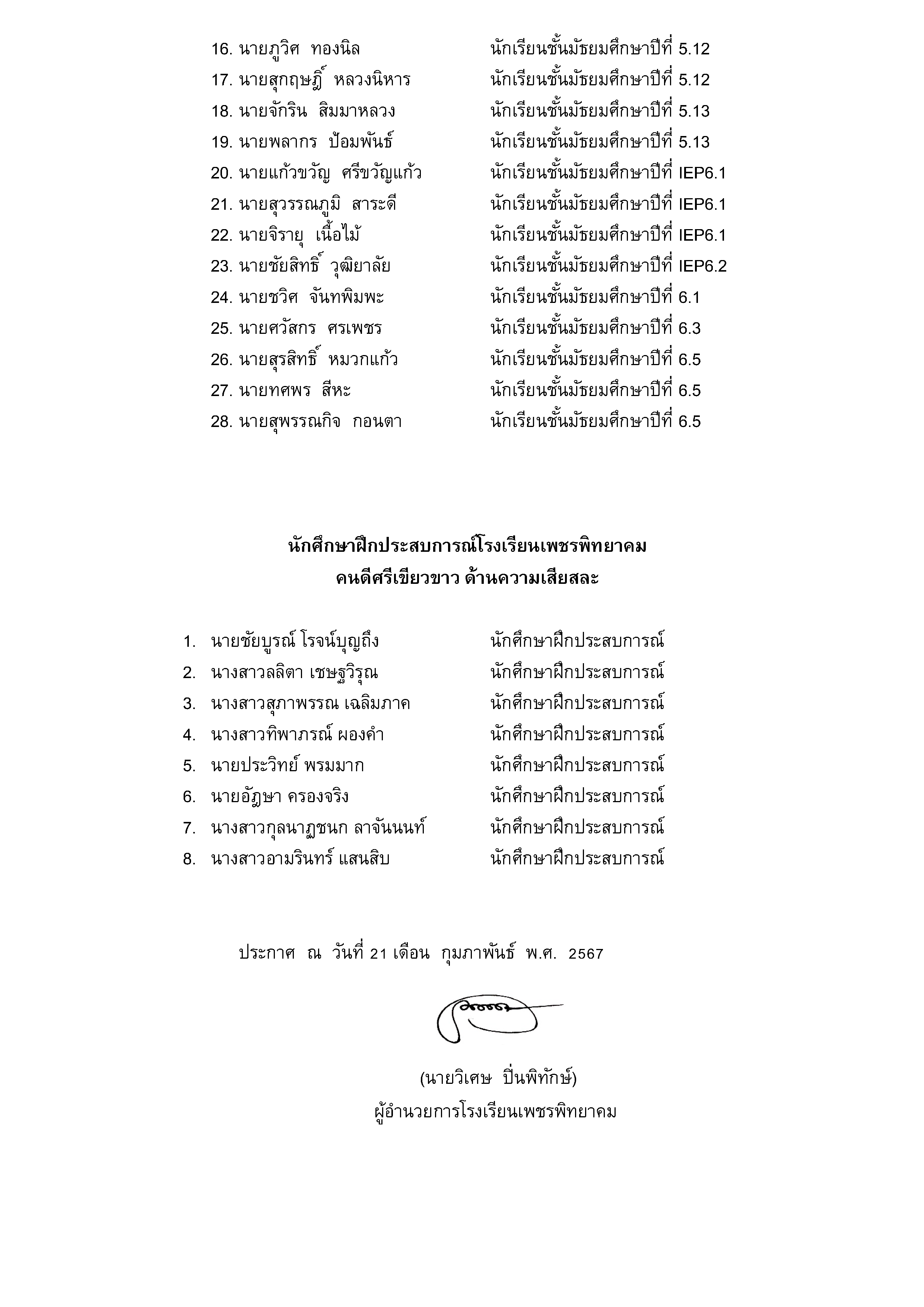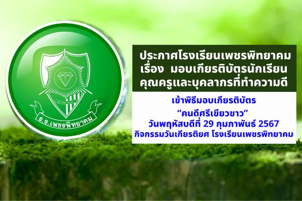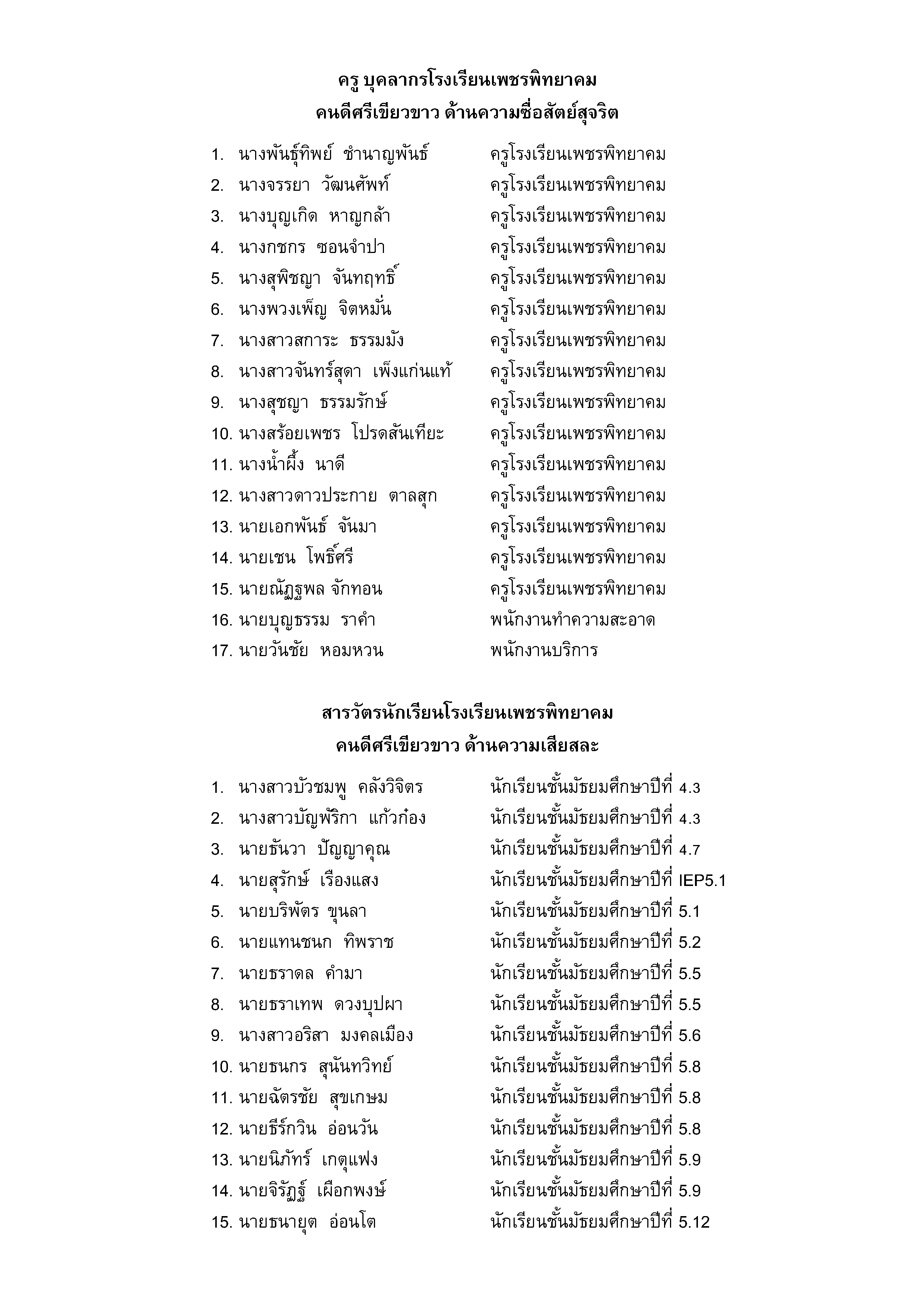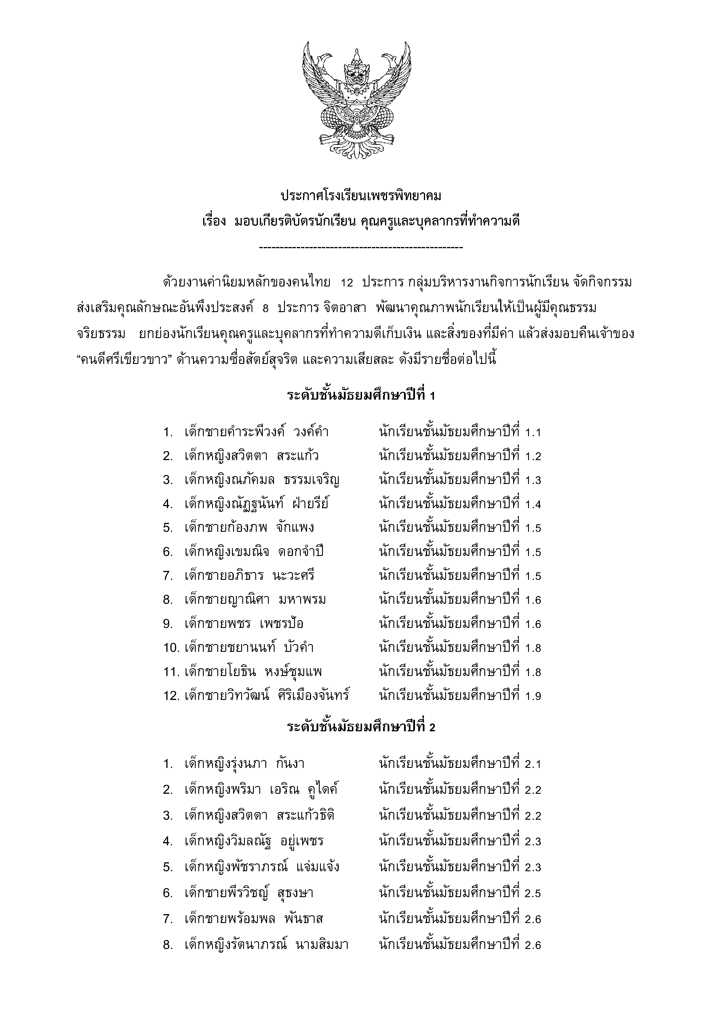 ประกาศโรงเรียนเพชรพิทยาคม เรื่อง มอบเกียรติบัตรนักเรียน คุณครูและบุคลากรที่ทำความดี