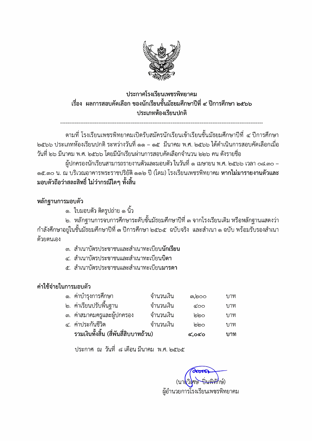 ประกาศโรงเรียนเพชรพิทยาคม เรื่อง ผลการสอบคัดเลือก ของนักเรียนชั้นมัธยมศึกษาปีที่ 4 ปีการศึกษา 2566 ประเภทห้องเรียนปกติ