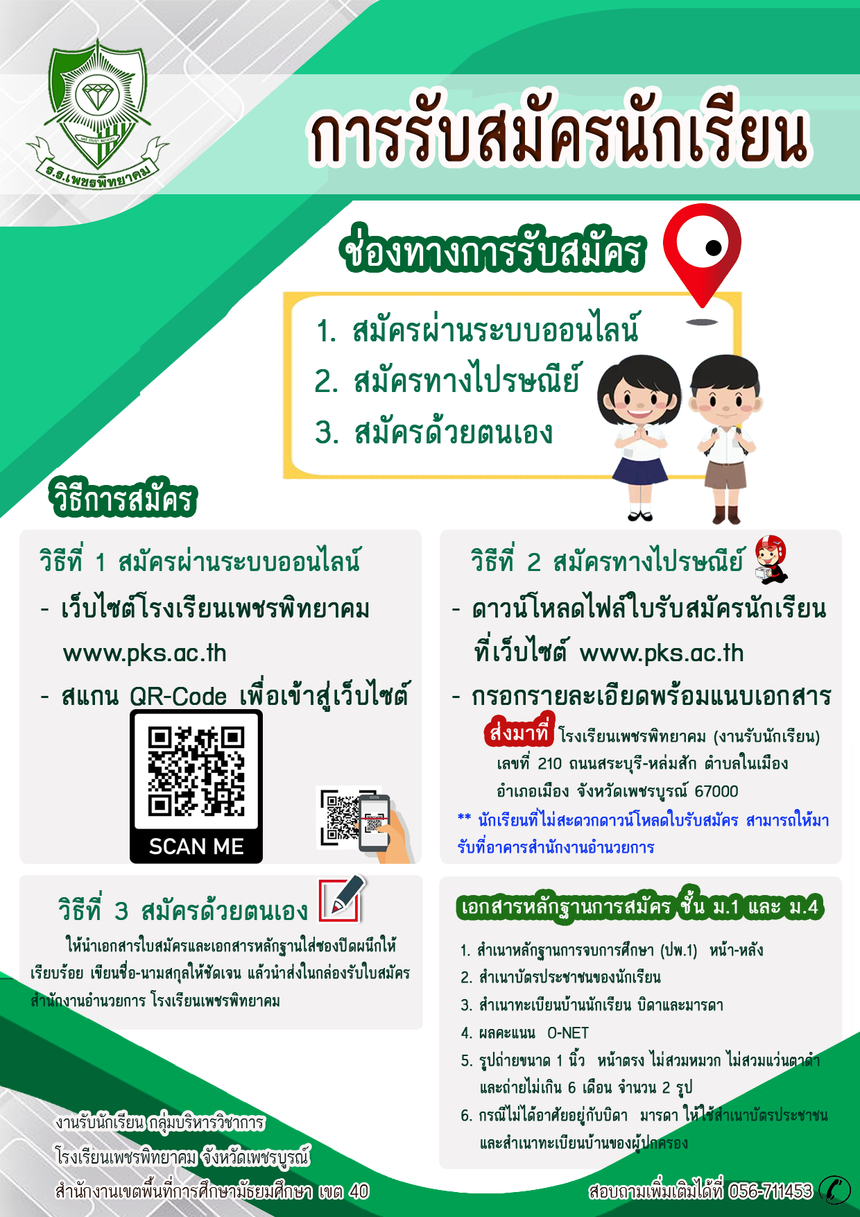 โรงเรียนเพชรพิทยาคม รับสมัครนักเรียนเข้าศึกษาต่อ ม.1 และ ม.4 ระหว่าง วันที่ 3-12 พฤษภาคม 2563 จำนวน 3 ช่องทาง สมัครผ่านระบบออนไลน์-สมัครทางไปรษณีย์-สมัครด้วยตนเอง