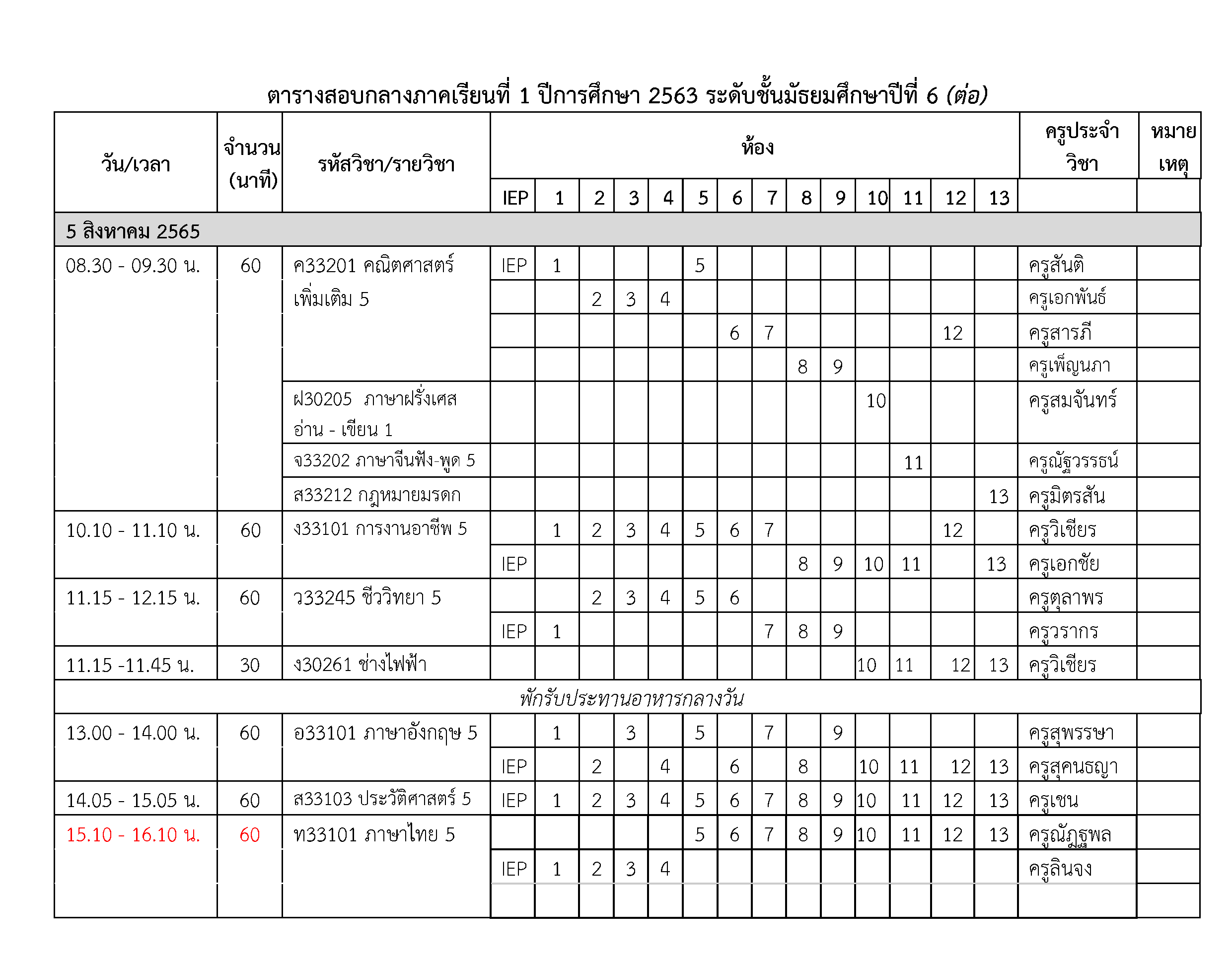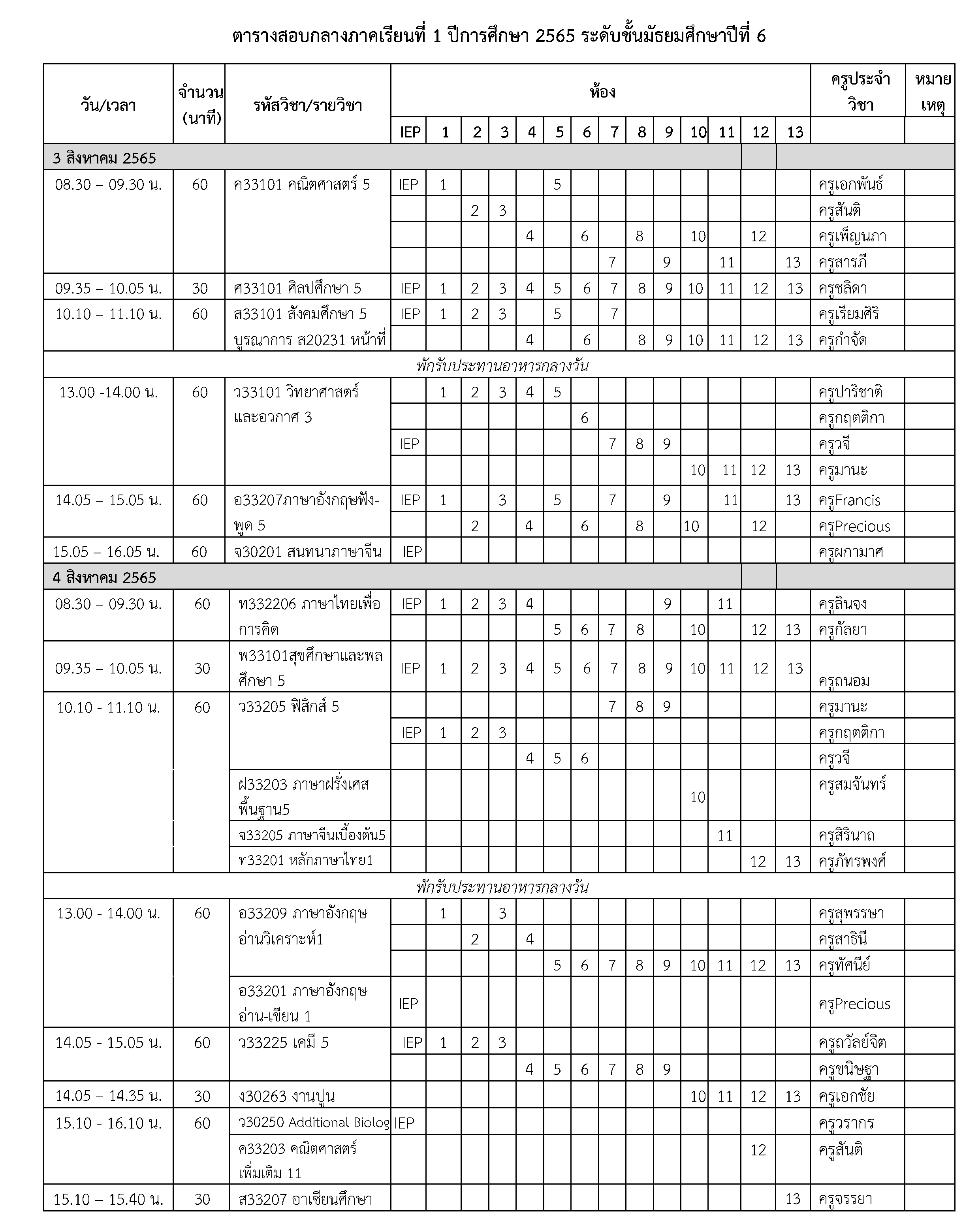 ตารางสอบกลางภาคเรียนที่ 1 ปีการศึกษา 2565 ระดับชั้นมัธยมศึกษาปีที่ 6 วันที่ 3-4-5 สิงหาคม 2565 (แก้ไข)