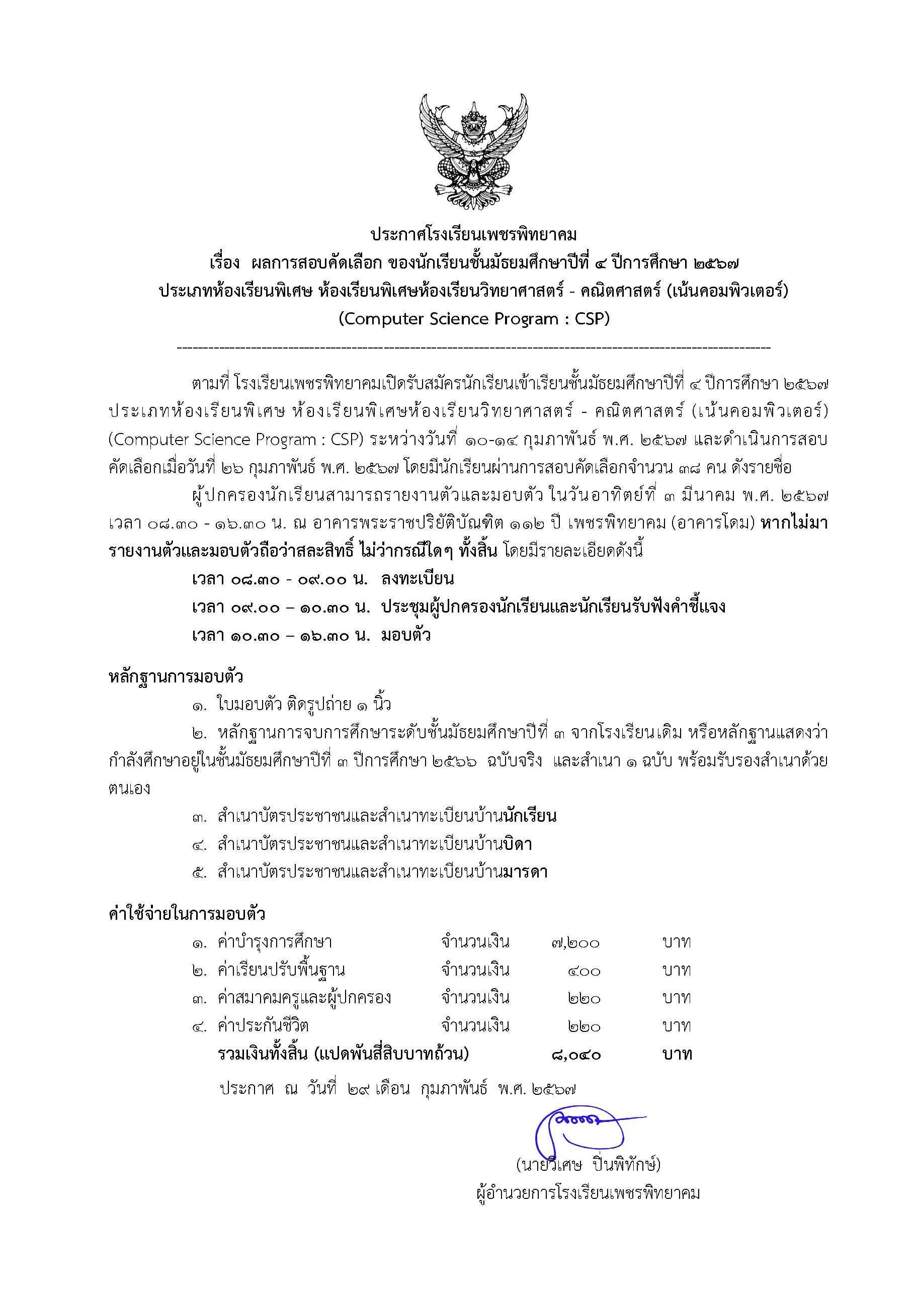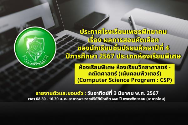 ประกาศโรงเรียนเพชรพิทยาคม เรื่อง ผลการสอบคัดเลือก ของนักเรียนชั้นมัธยมศึกษาปีที่ 4 ปีการศึกษา 2567 ประเภทห้องเรียนพิเศษ ห้องเรียนพิเศษห้องเรียนวิทยาศาสตร์ - คณิตศาสตร์ (เน้นคอมพิวเตอร์) (Computer Science Program : CSP)