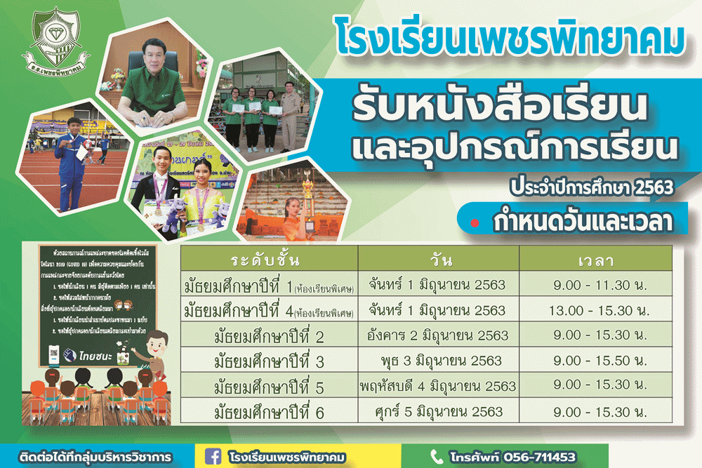 โรงเรียนเพชรพิทยาคม กำหนดวันและเวลา รับหนังสือ-อุปกรณ์การเรียน ประจำปีการศึกษา 2563