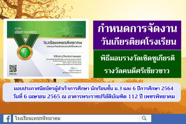 กำหนดการจัดงานวันเกียรติยศโรงเรียน พิธีมอบรางวัลเชิดชูเกียรติ รางวัลคนดีศรีเขียวขาว มอบประกาศนียบัตรผู้สำเร็จการศึกษานักเรียนชั้นมัธยมศึกษาปีที่ 3 และ 6 ปีการศึกษา 2564 วันที่ 6 เมษายน 2565 ณ อาคารพระราชปริยัติบัณฑิต 112 ปี เพชรพิทยาคม