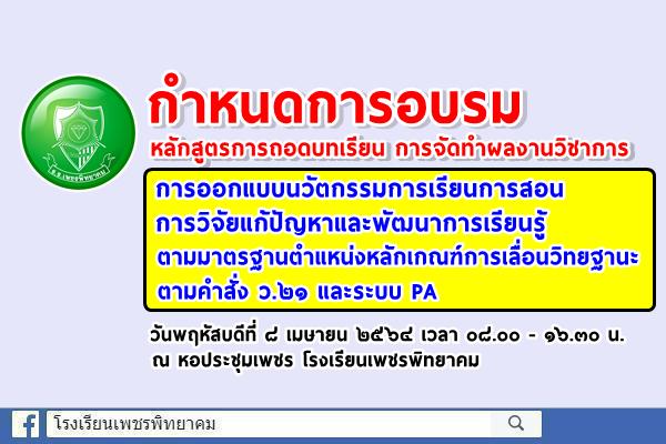 ด้วยกลุ่มบริหารงานบุคคล โรงเรียนเพชรพิทยาคม กำหนดจัดการอบรมเชิงปฏิบัติการพัฒนาข้าราชการ ครูและบุคลากรทางการศึกษา โรงเรียนเพชรพิทยาคม เรื่อง “หลักสูตรการถอดบทเรียน การจัดทำผลงานวิชาการ การออกแบบนวัตกรรมการเรียนการสอนการวิจัยแก้ปัญหาและพัฒนาการเรียนรู้ตามมาตรฐานตำแหน่ง หลักเกณฑ์ การเลื่อนวิทยฐานะ ตามคำสั่ง ว.๒๑ และระบบ PA ” ในวันพฤหัสบดีที่ ๘ เมษายน ๒๕๖๔ เวลา ๐๘.๐๐ -๑๖.๓๐ น. ณ หอประชุมเพชร โรงเรียนเพชรพิทยาคม