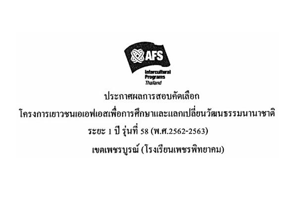 ประกาศผลการสอบคัดเลือกโครงการเยาวชนเอเอฟเอสเพื่อการศึกษาและแลกเปลี่ยนวัฒนธรรมนานาชาติ ระยะ 1 ปี รุ่นที่ 58 (พ.ศ.2562-2563) เขตเพชรบูรณ์ (โรงเรียนเพชรพิทยาคม)