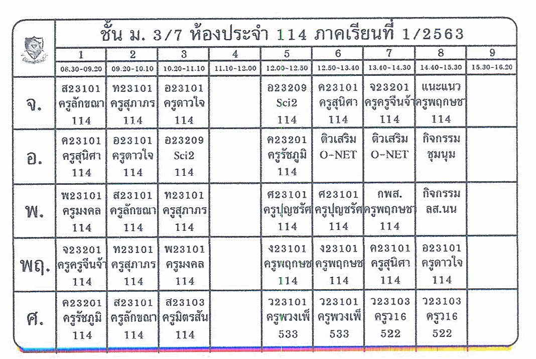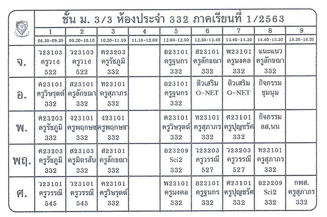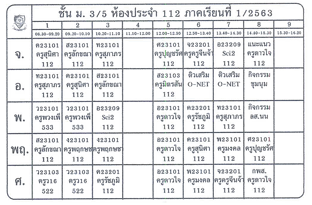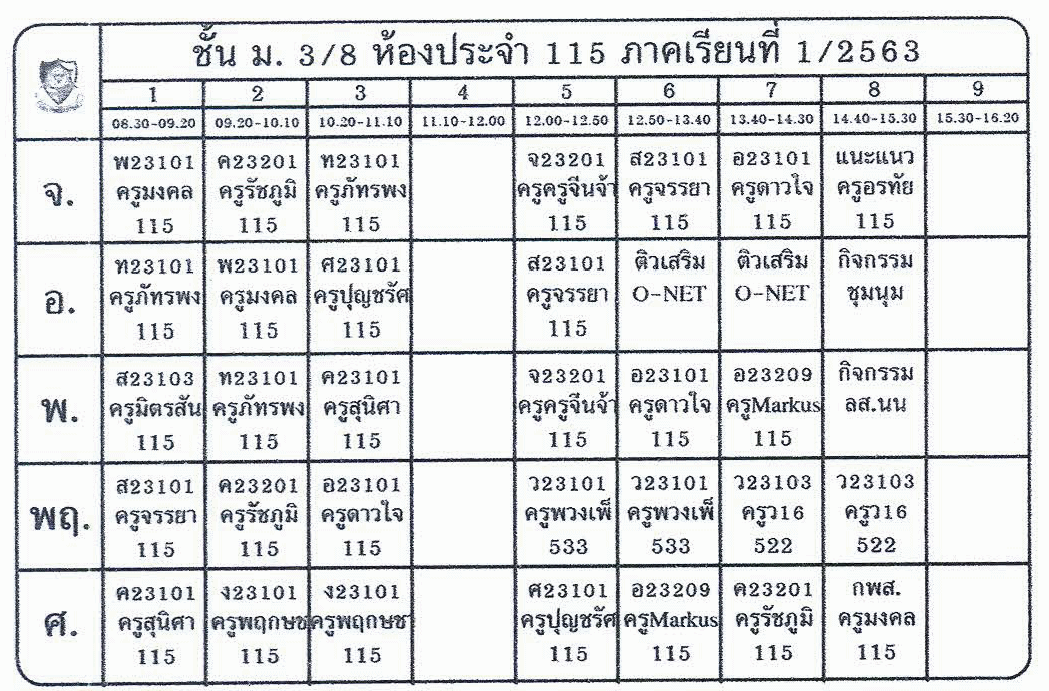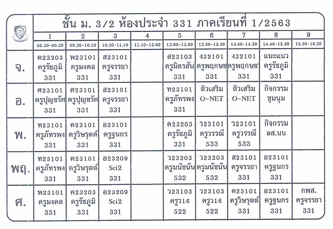 ตารางเรียนนักเรียน ชั้นม.3 ภาคเรียนที่ 1 ปีการศึกษา 2563