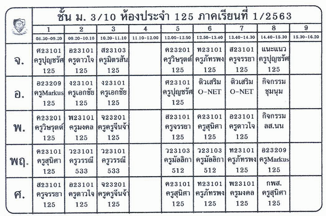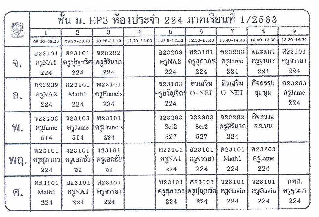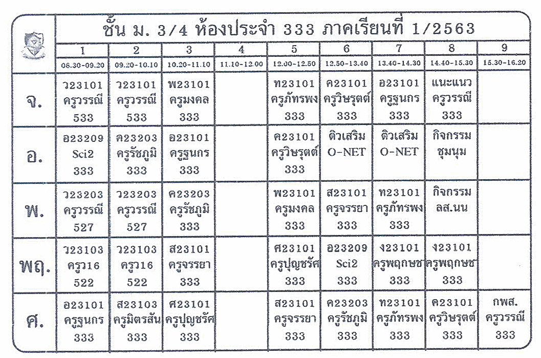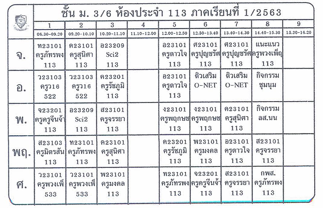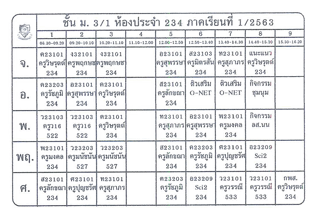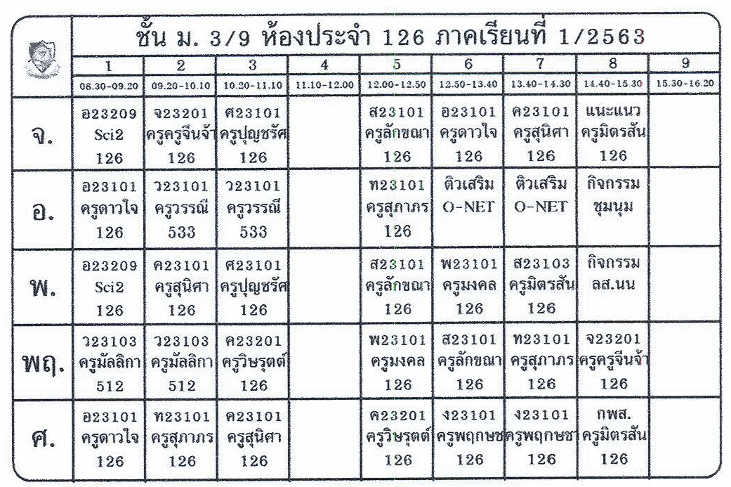 ตารางเรียนนักเรียน ชั้นม.3 ภาคเรียนที่ 1 ปีการศึกษา 2563