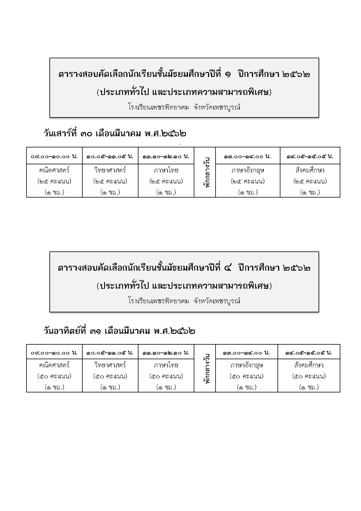 ตารางสอบคัดเลือกนักเรียนชั้นมัธยมศึกษาปีที่ 1 และ 4 ปีการศึกษา 2562 (ประเภททั่วไป และประเภทความสามารถพิเศษ) โรงเรียนเพชรพิทยาคม จังหวัดเพชรบูรณ์